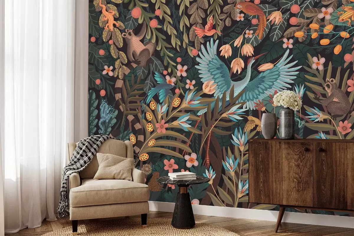 Fototapety Fantazijná scéna s vtákmi a zvieratami medzi rastlinami Nr. w05024