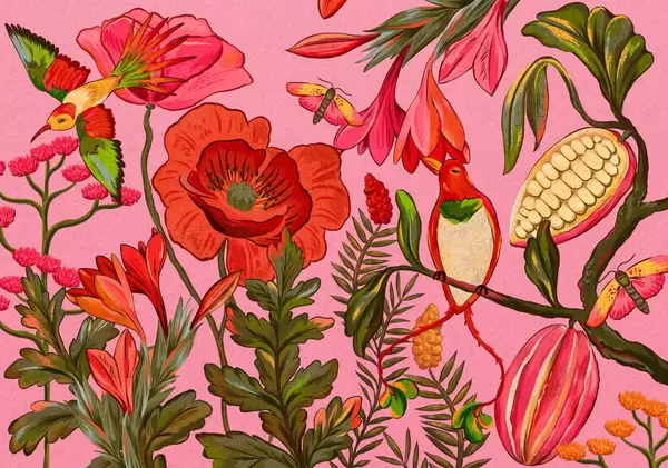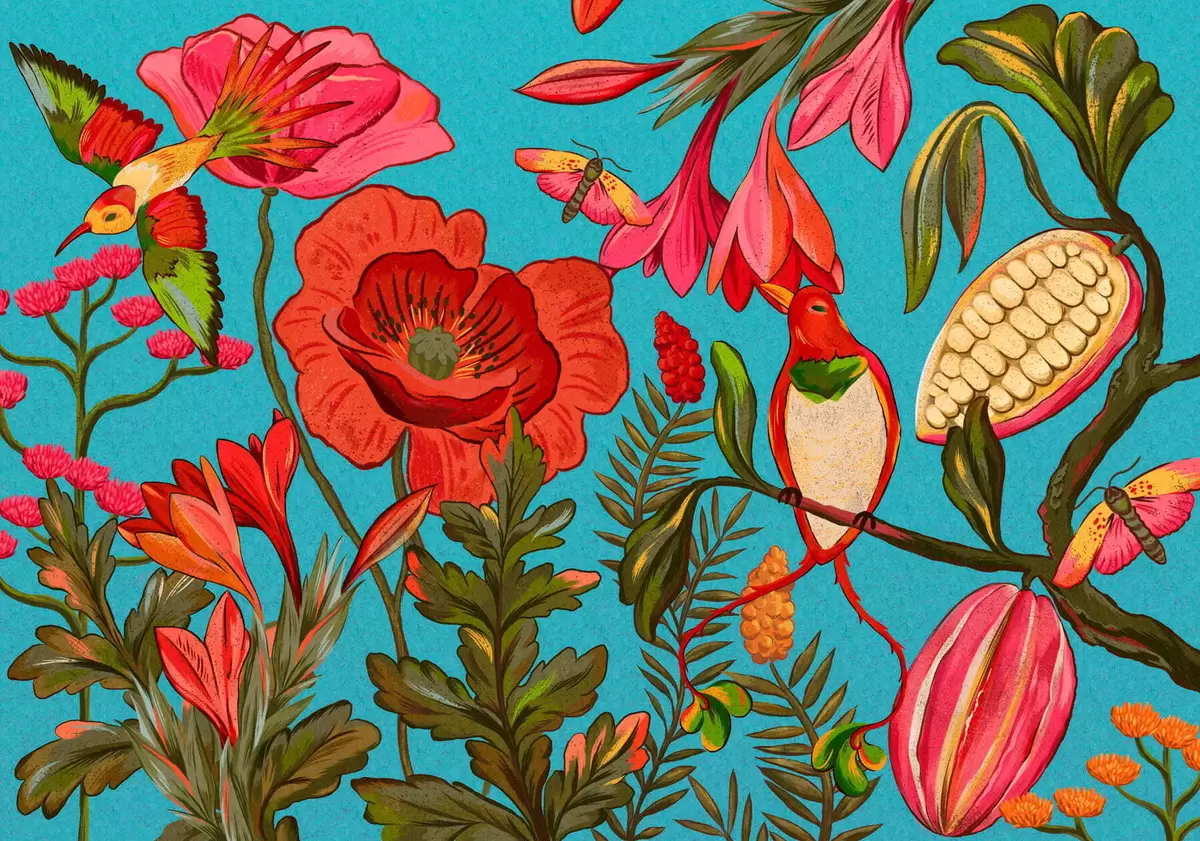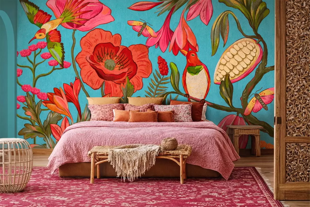 Fototapety Dekoratívne kvety a vtáky na modrom pozadí Nr. w05036v3