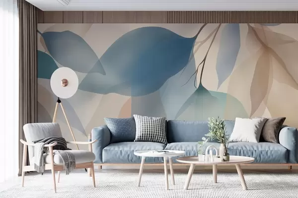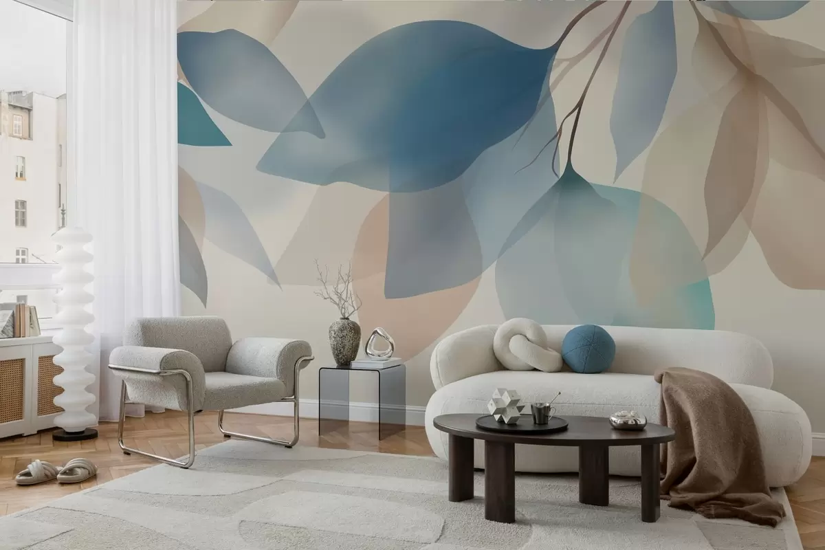 Fototapety elegantné polopriehľadné listy v odtieňoch modrej a béžovej Nr. w05060