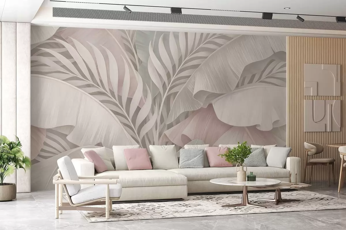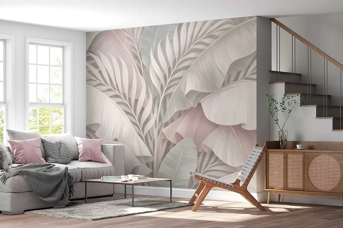 Fototapety veľké tropické listy v chladných odtieňoch ružovej a šedej Nr. w05062v1