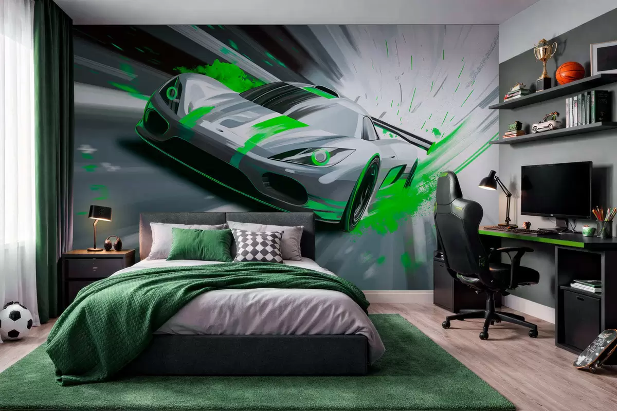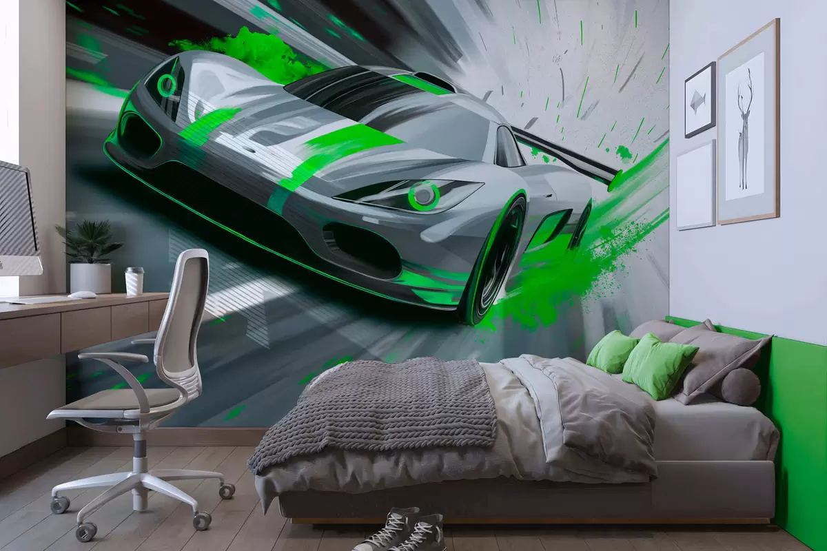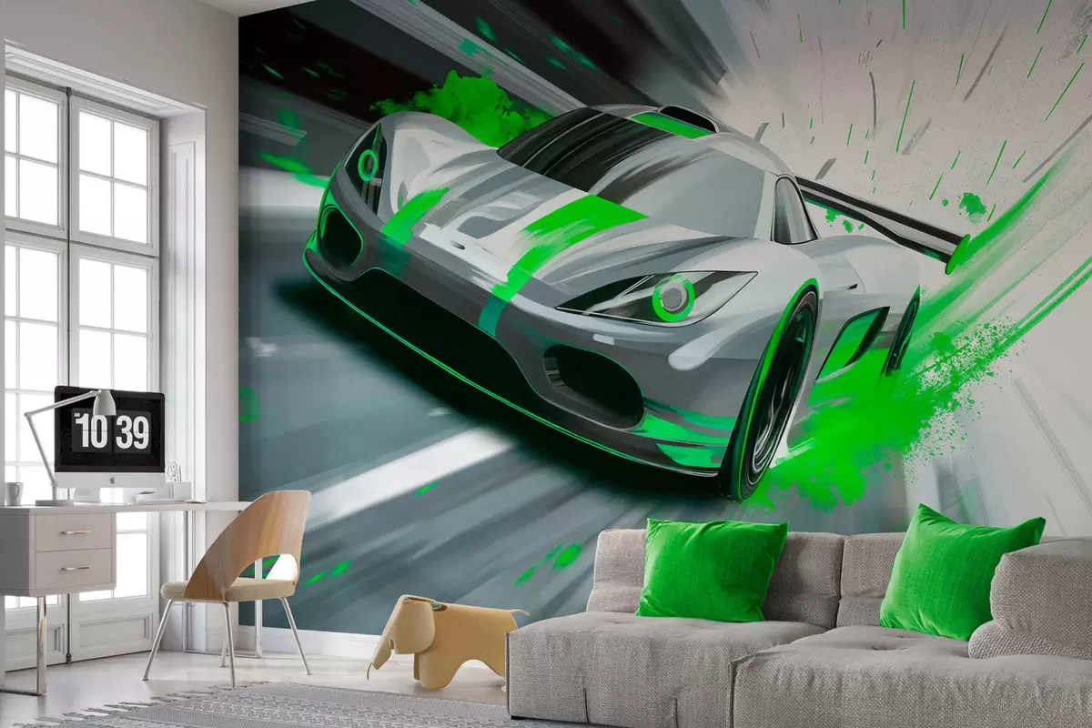 Fototapety dynamické športové auto v digitálnom štýle kresby so zelenými akcentmi Nr. w05069v4