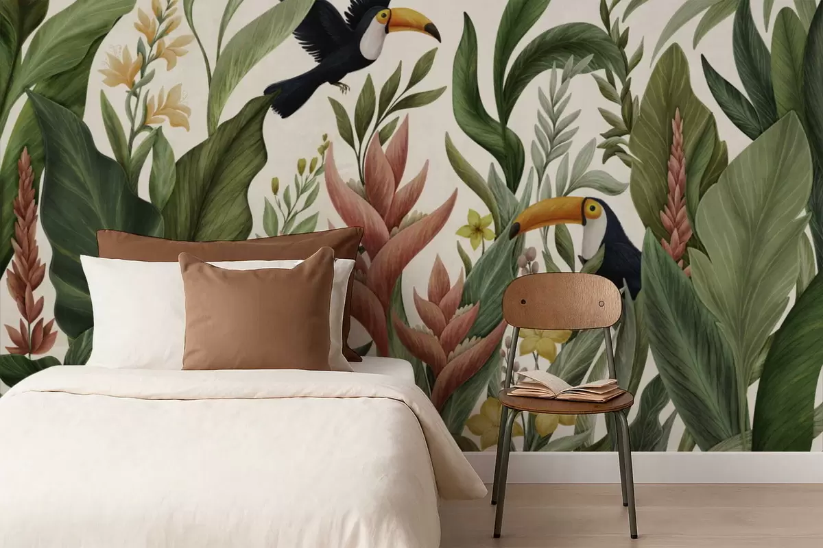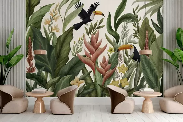 Fototapety Tropické rastliny a vtáky s veľkými zobákmi na svetlom pozadí Nr. w05088v1