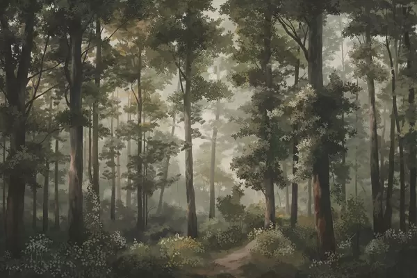 Fototapety Ilustrácia lesa s hmlou, vysokými stromami a cestičkou Nr. w05089