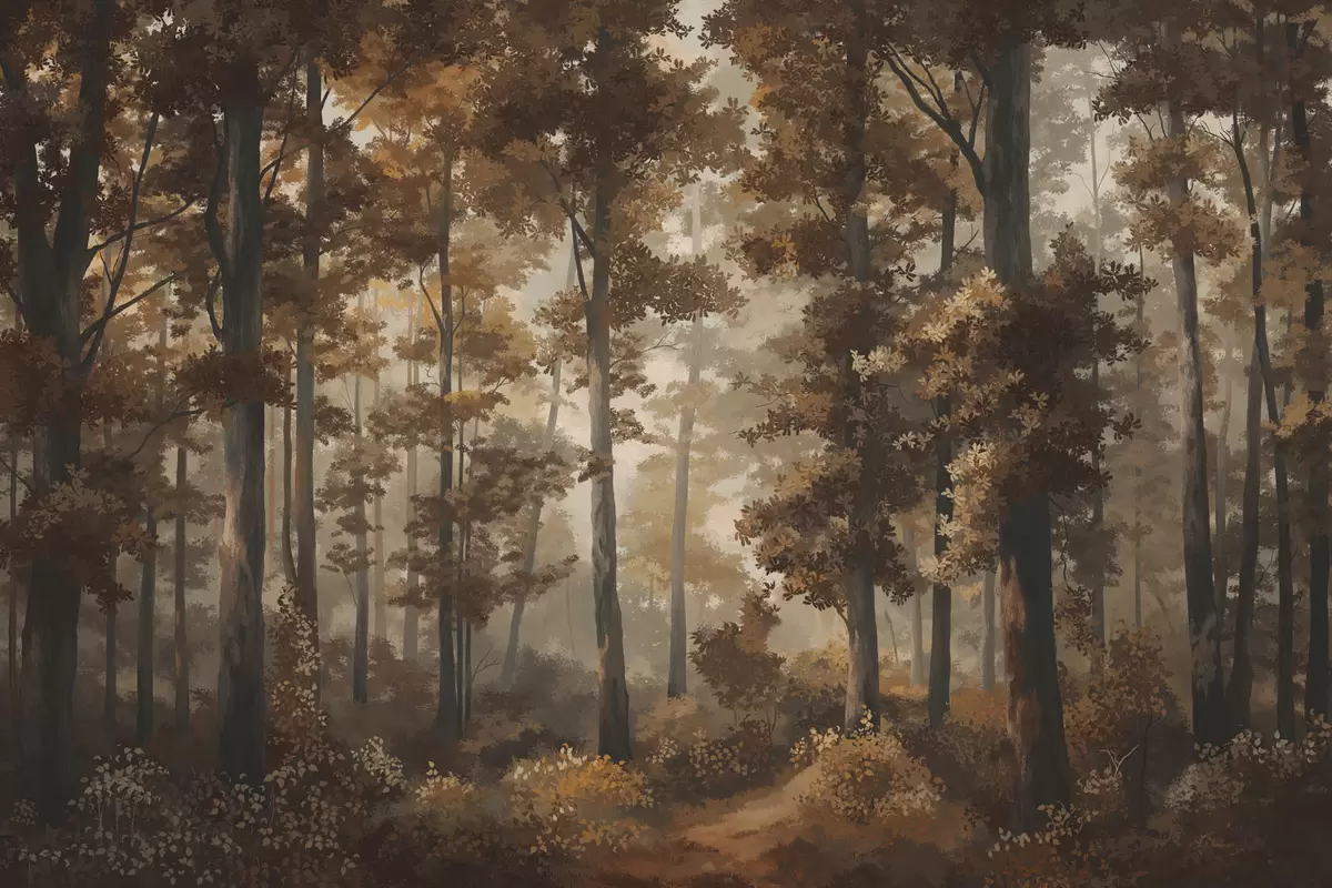 Fototapety Jesenná lesná scéna s teplým svetlom a hustými stromami Nr. w05089v1