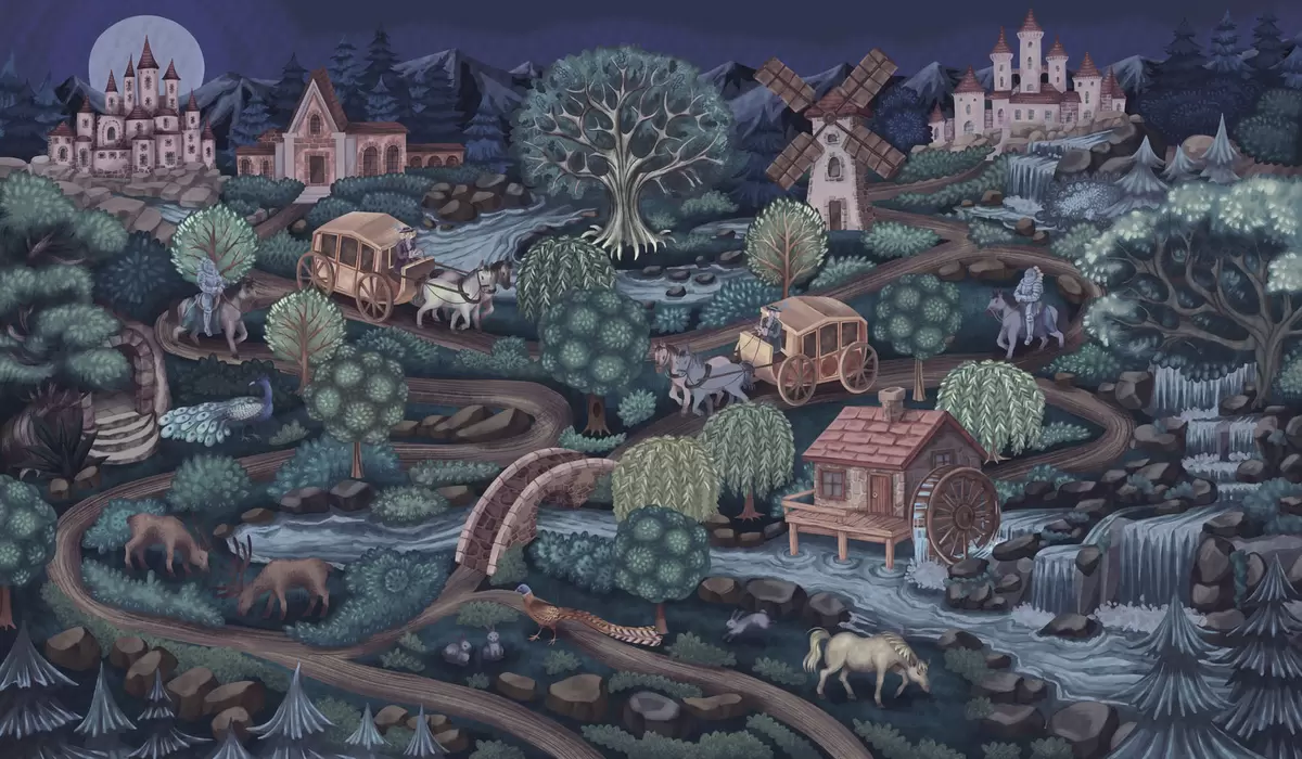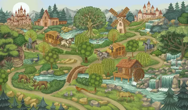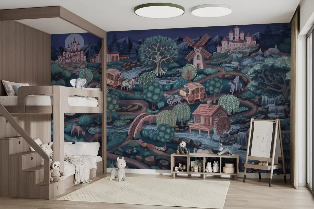Fototapety Nočná rozprávková scéna s hradmi, mlynmi a lesom Nr. w05091
