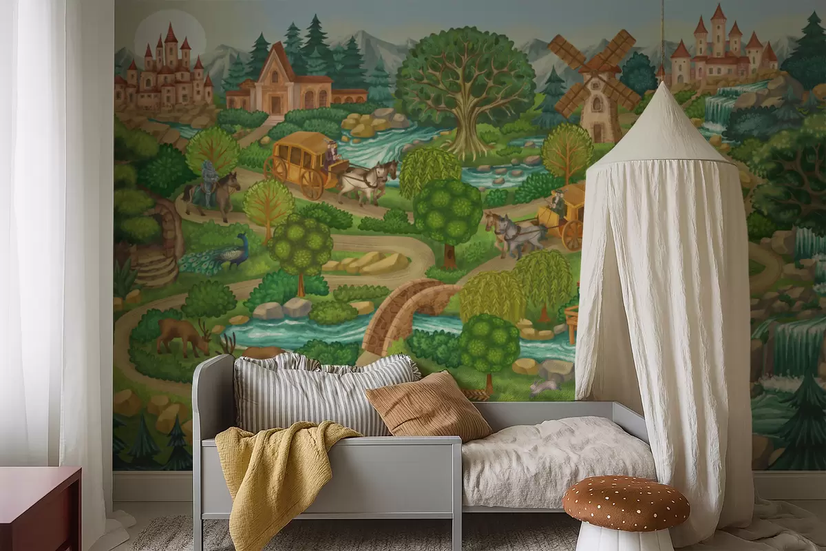 Fototapety Ilustrácia víly s hradmi, lesom, riekami a cestovateľmi Nr. w05091v1