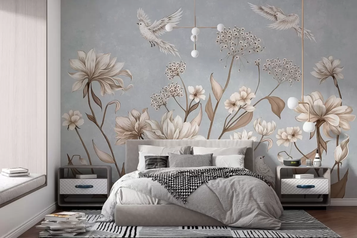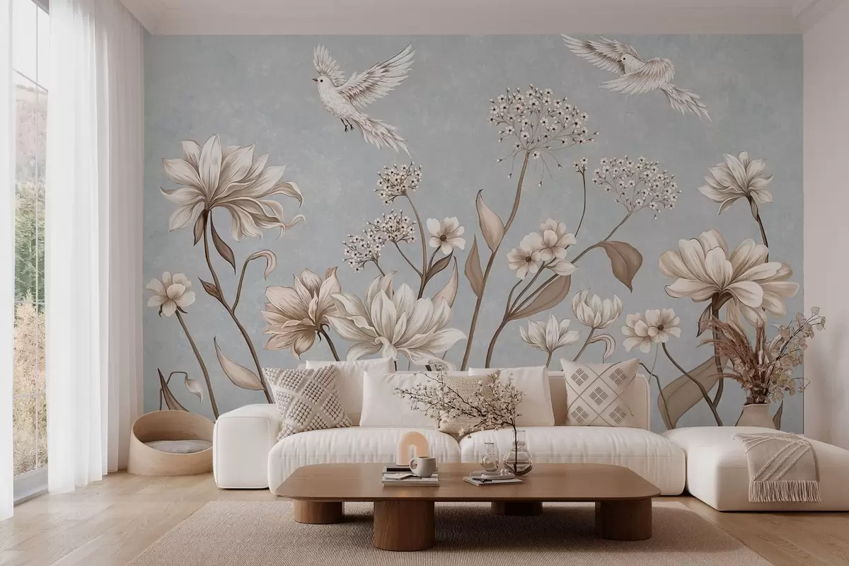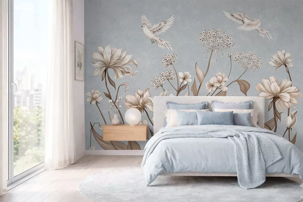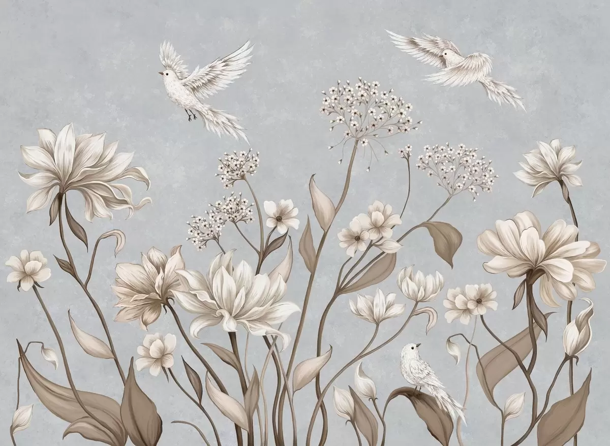 Fototapety Kvety a vtáky na chladnom šedo-modrom pozadí Nr. w05118v2
