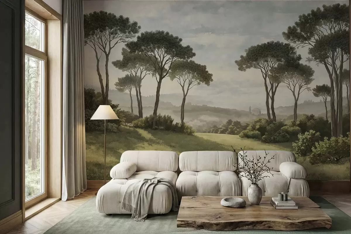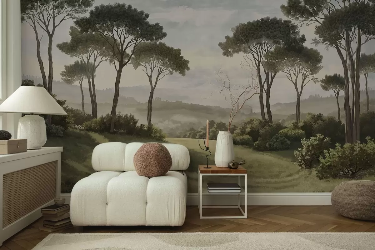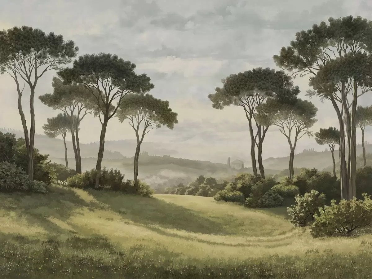 Fototapety Krajina so stromami, lúkou a hmlou v diaľke Nr. w05122v1