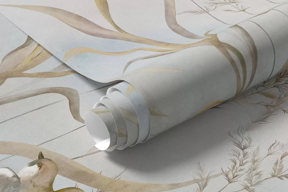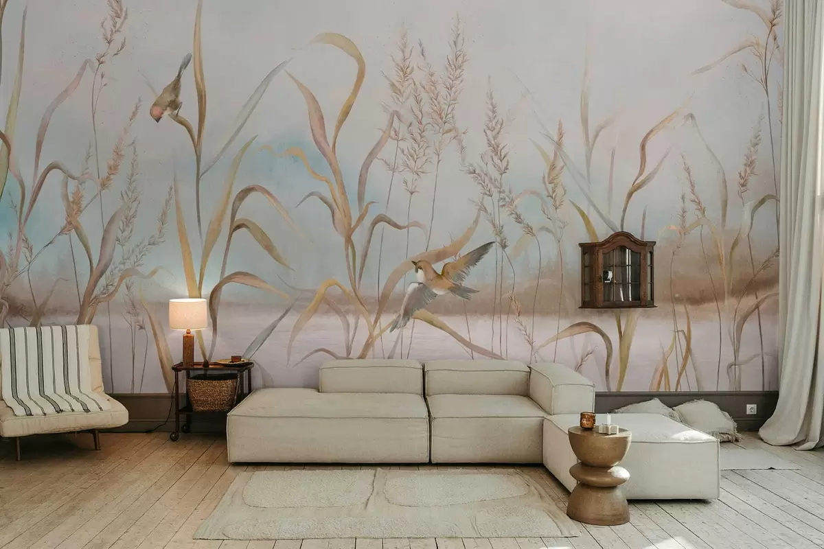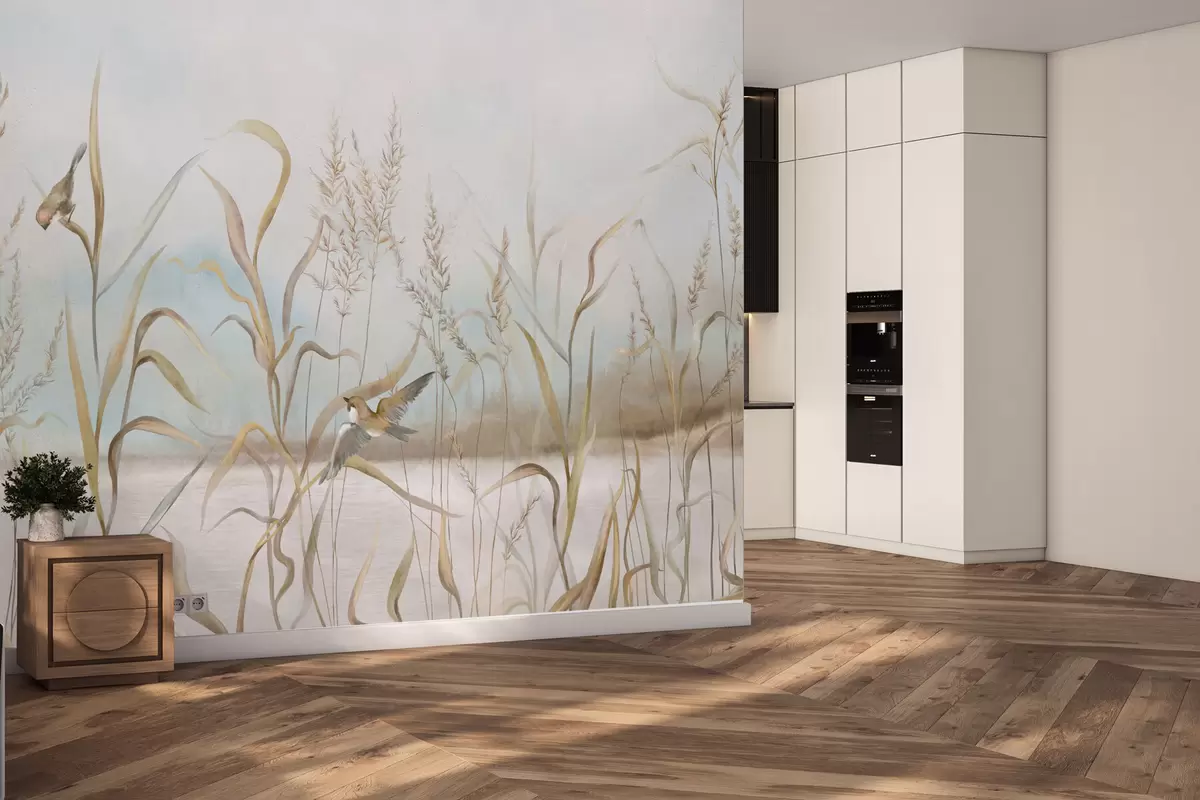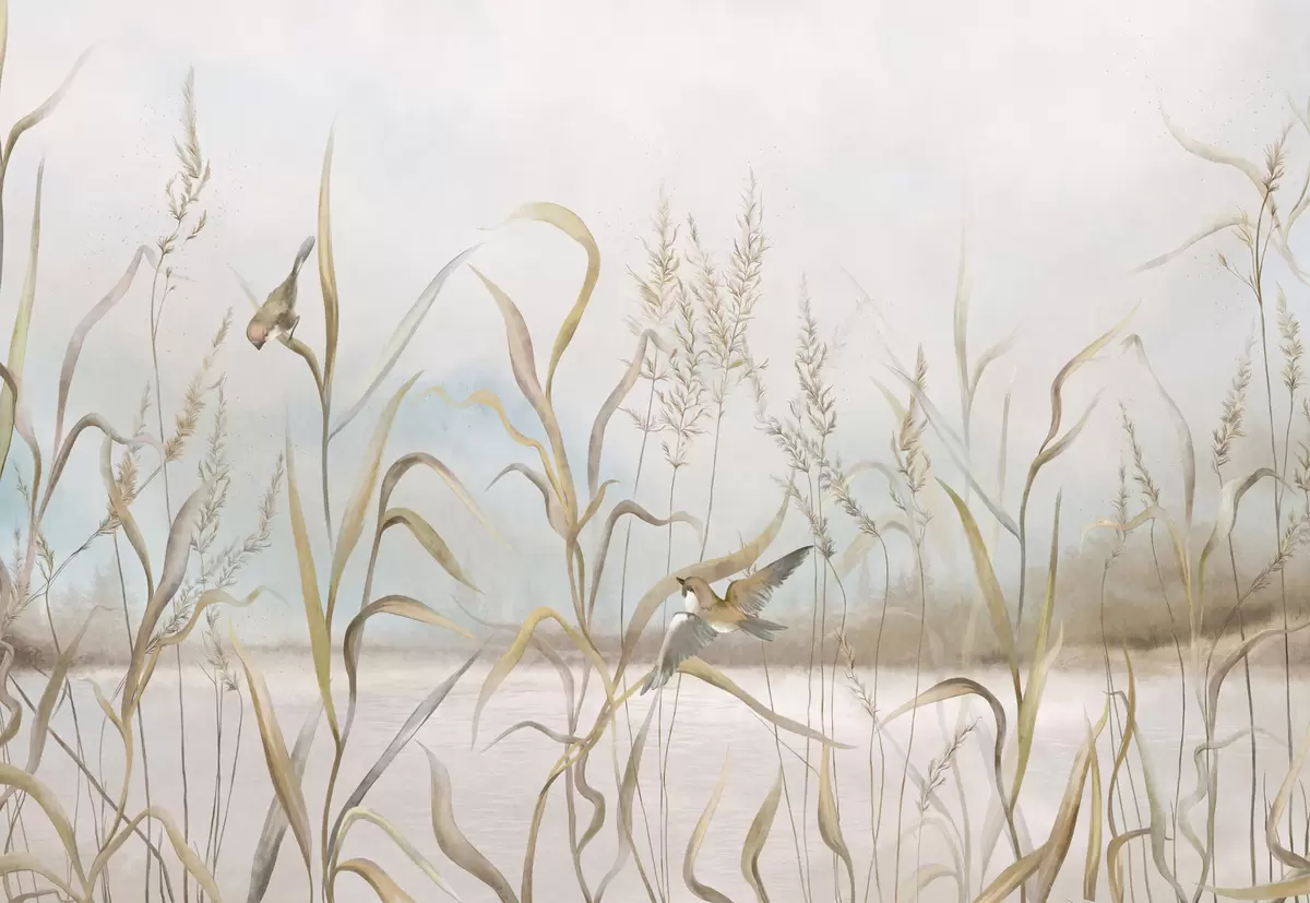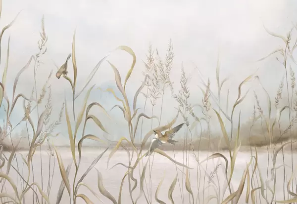Fototapety Ilustrácia trstiny a vtákov pri vode v jemných tónoch Nr. w05125