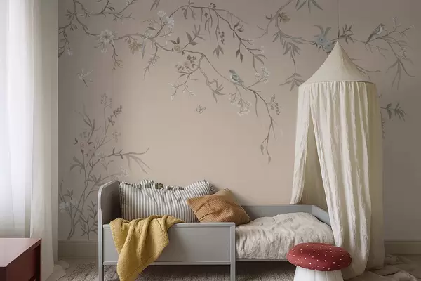 Fototapety Kvetinové vetvy s vtákmi na teplom béžovom pozadí Nr. w05127v1