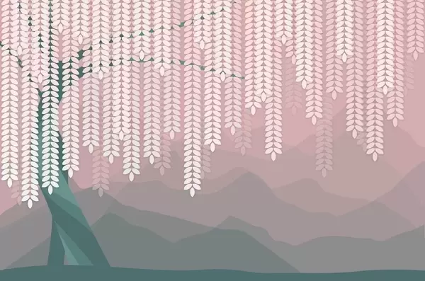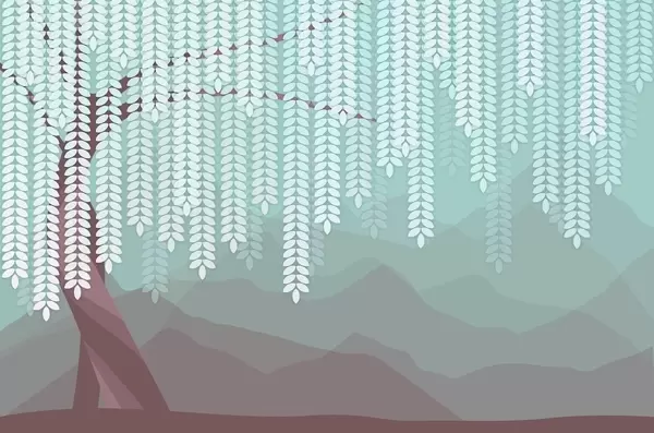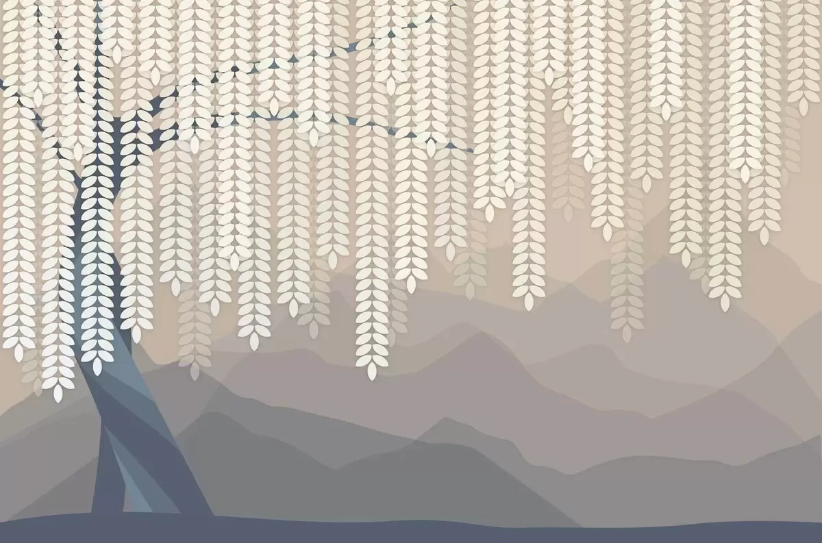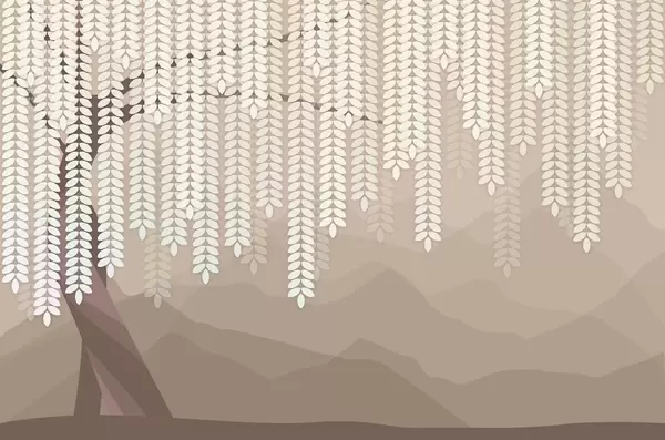 Fototapety stylizovaný vŕbový strom s visiacimi listami na pozadí minimalistických hôr v odtieňoch béžovej a modrozelenej farby Nr. w05232