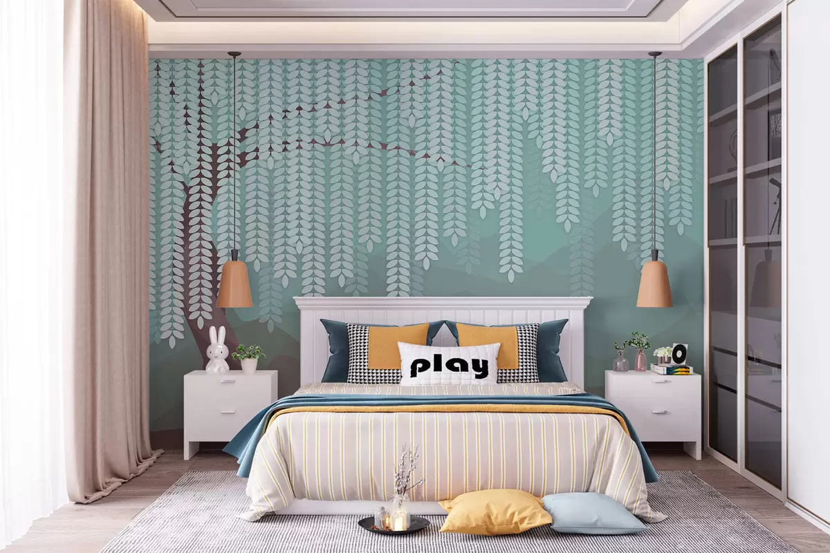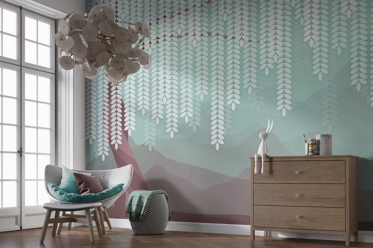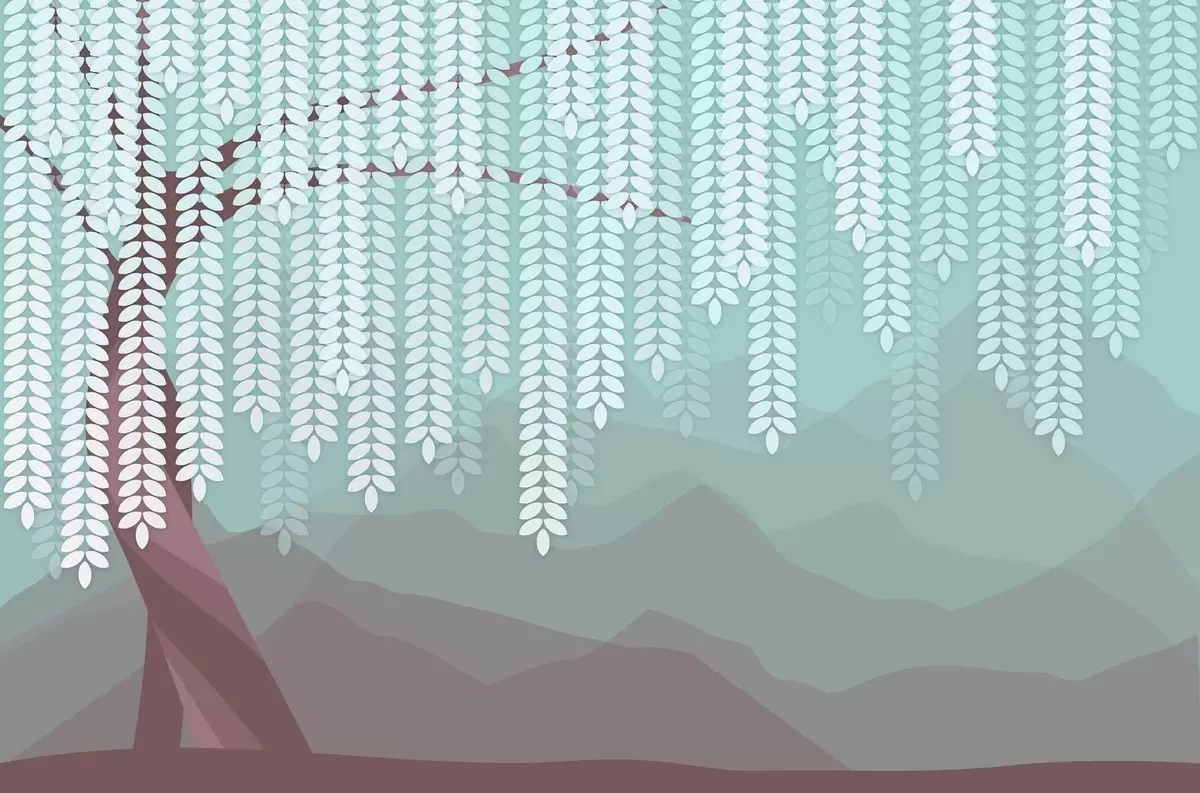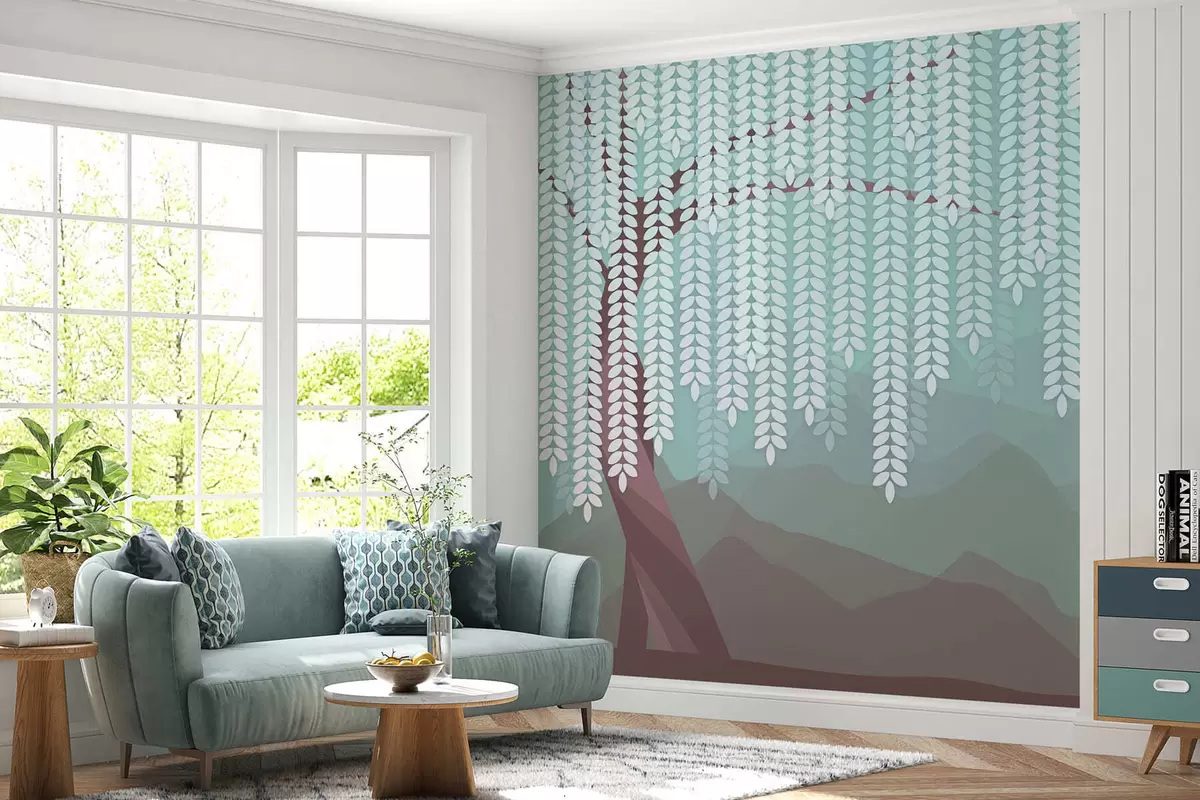 Fototapety stylizovaný vŕbový strom s visiacimi listami na pozadí minimalistických hôr v odtieňoch čokolády a tyrkysovej farby Nr. w05232v1