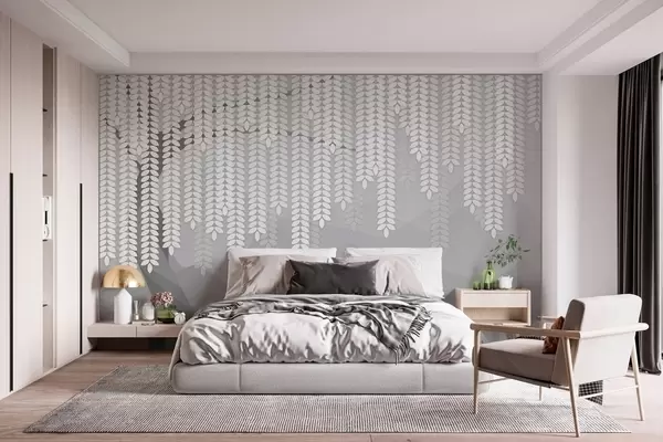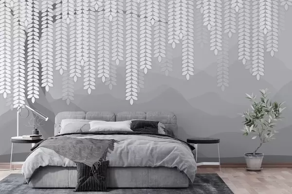 Fototapety stylizovaný vŕbový strom s visiacimi listami na pozadí minimalistických hôr v odtieňoch šedej farby Nr. w05232v3