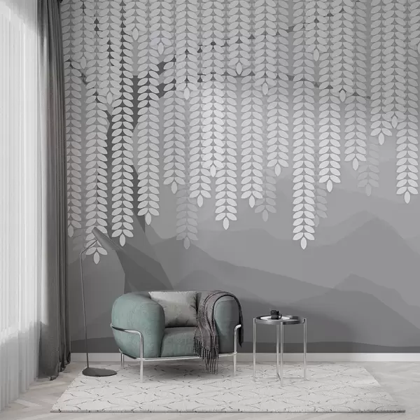 Fototapety stylizovaný vŕbový strom s visiacimi listami na pozadí minimalistických hôr v odtieňoch šedej farby Nr. w05232v3