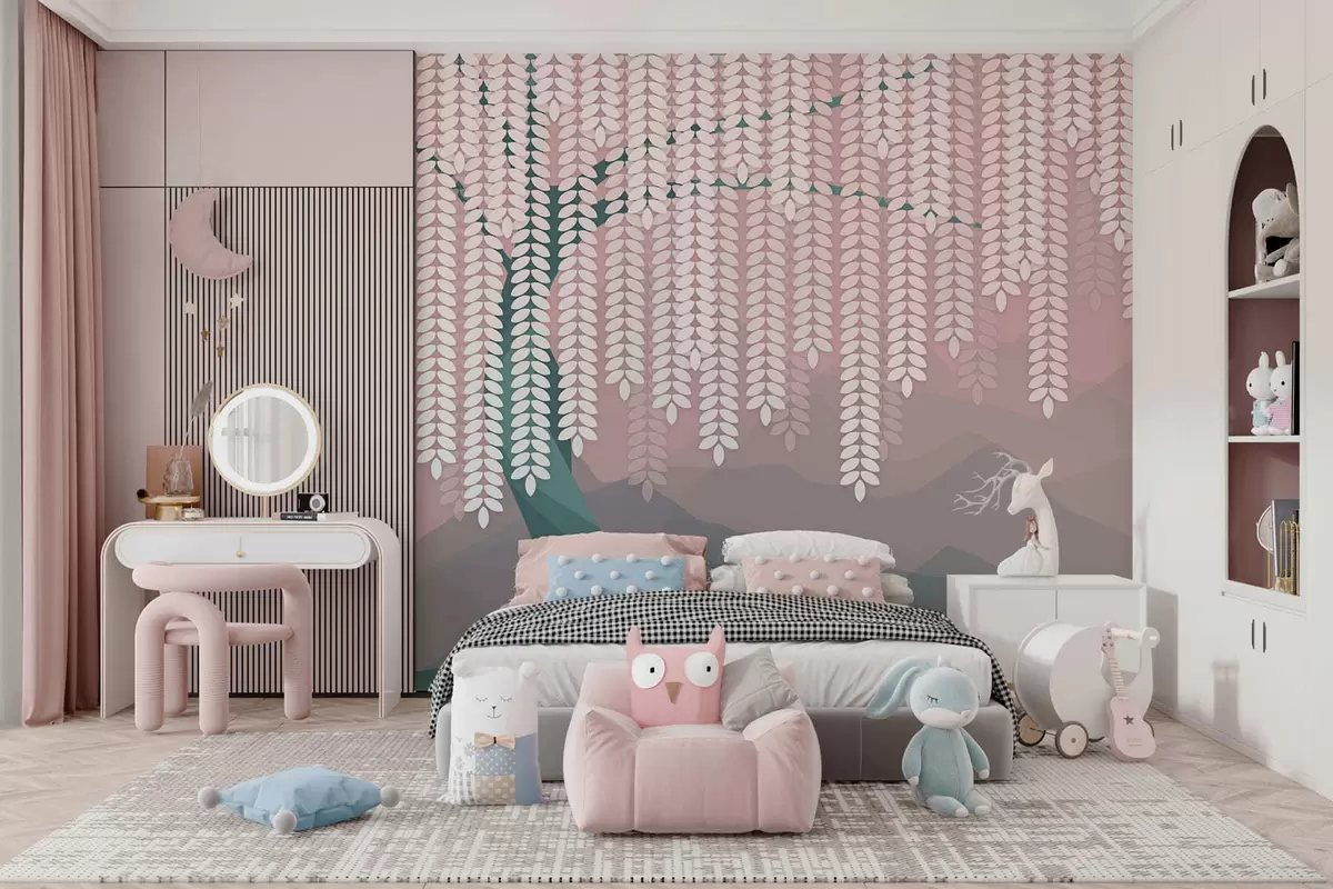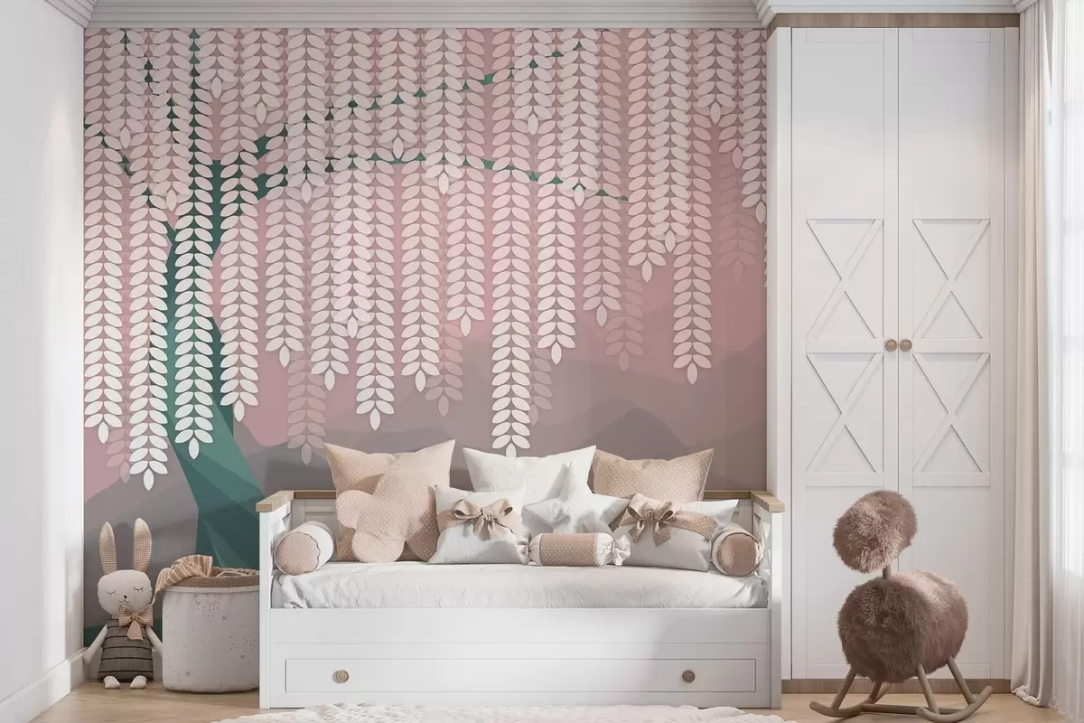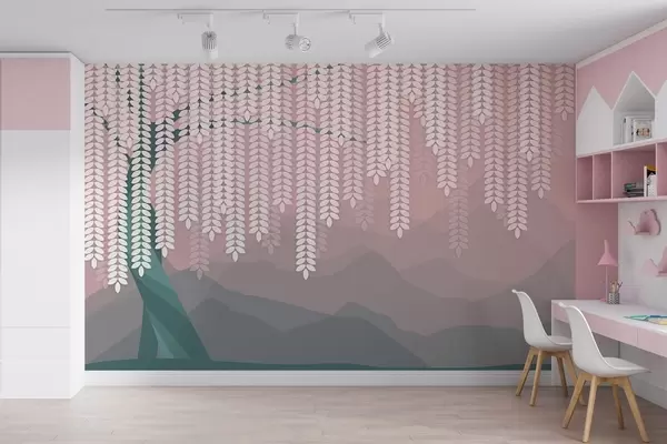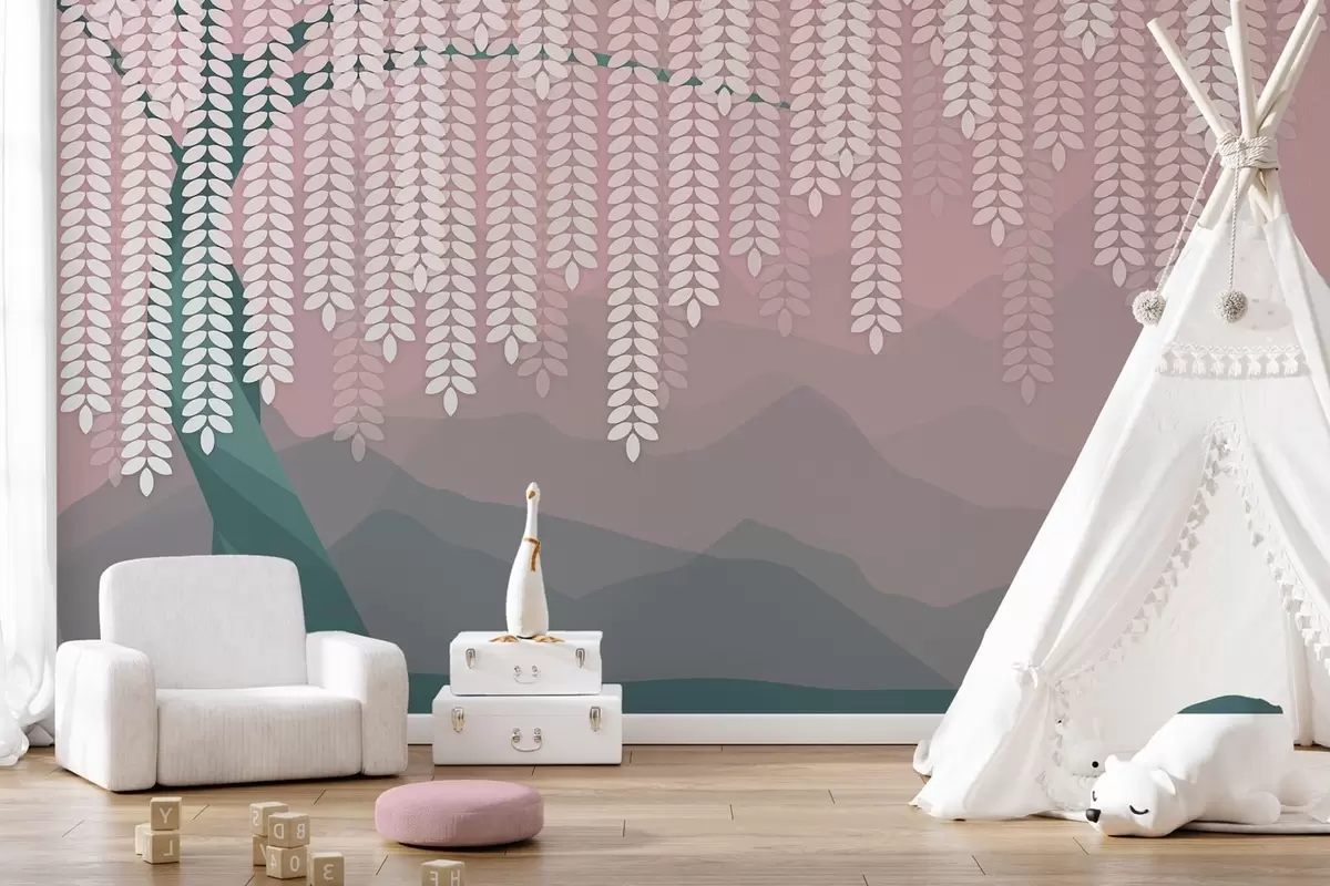 Fototapety stylizovaný vŕbový strom s visiacimi listami na pozadí minimalistických hôr v odtieňoch ružovej a tmavozelenej farby Nr. w05232v4