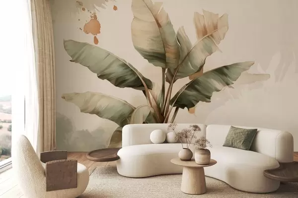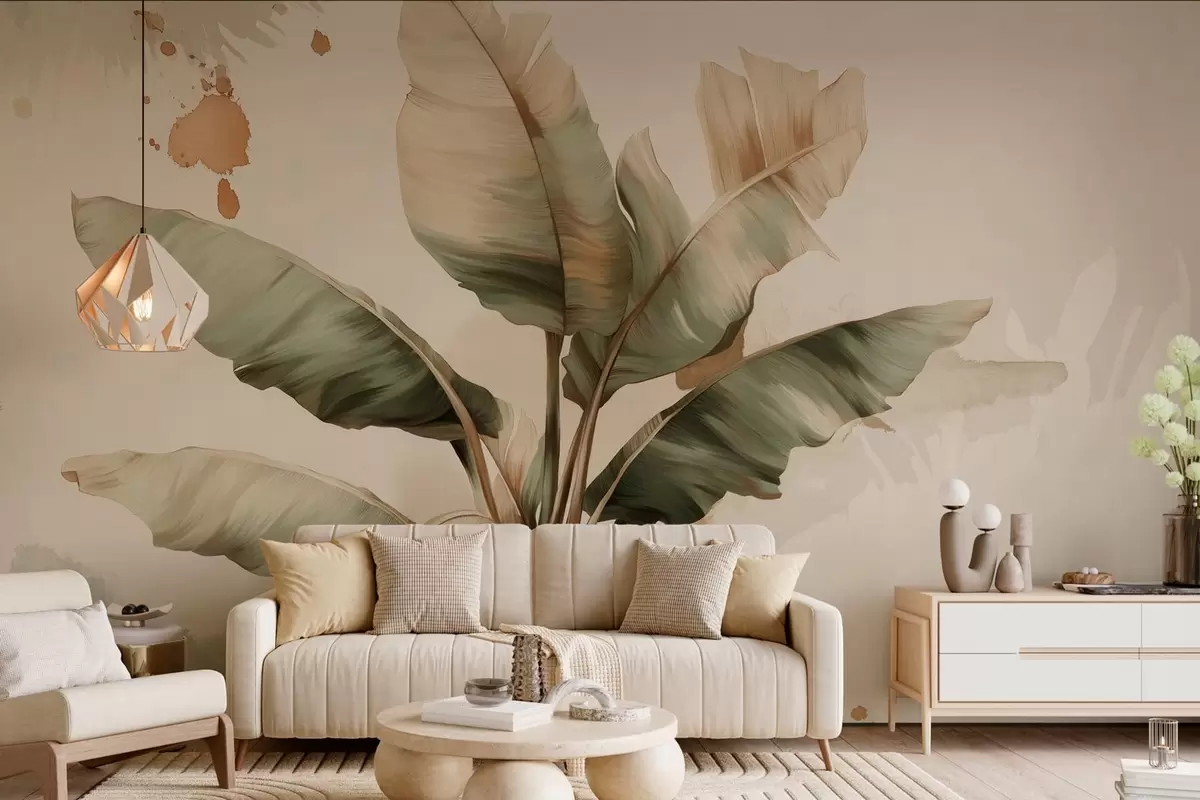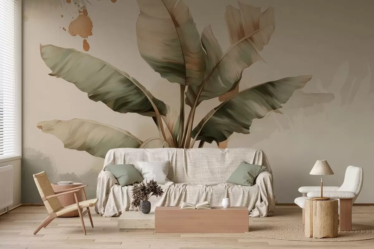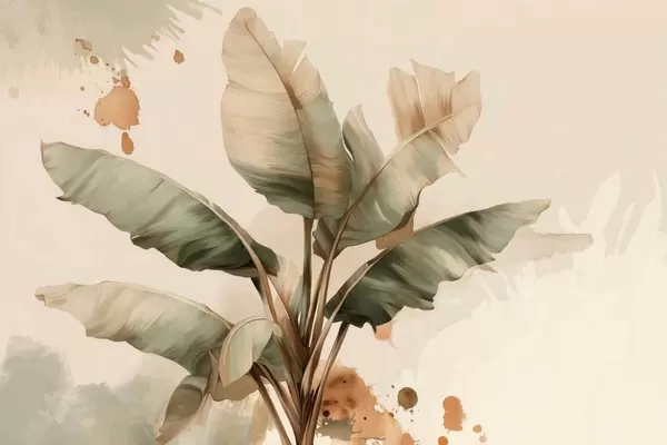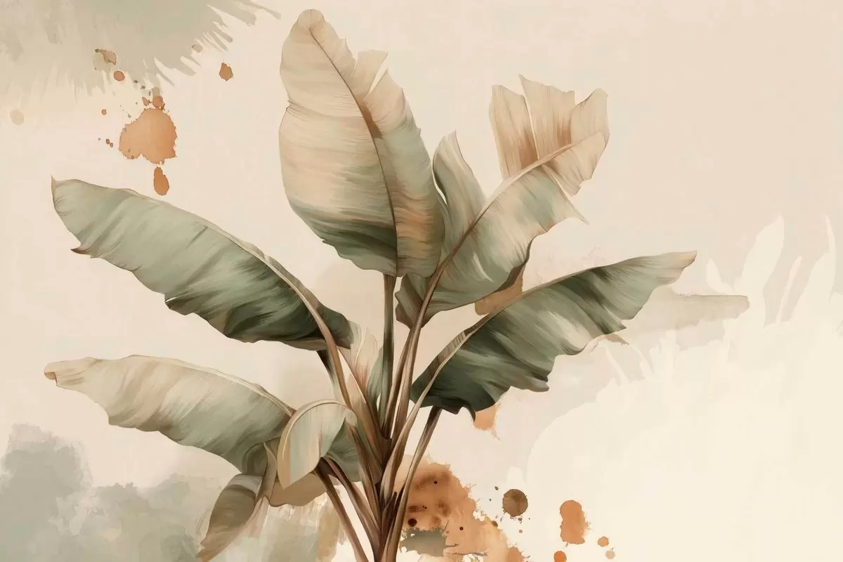 Fototapety veľký, malebný zhluk banánových listov s farebnými škvrnami v retro štýle Nr. w05384