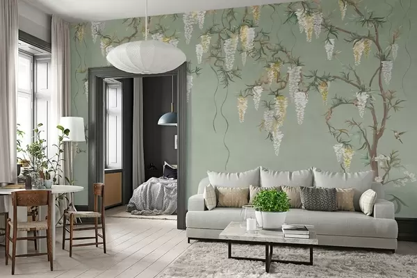 Fototapety Kvitnúce vetvičky s bielymi kvetmi a vtákmi na zelenom pozadí Nr. w05394