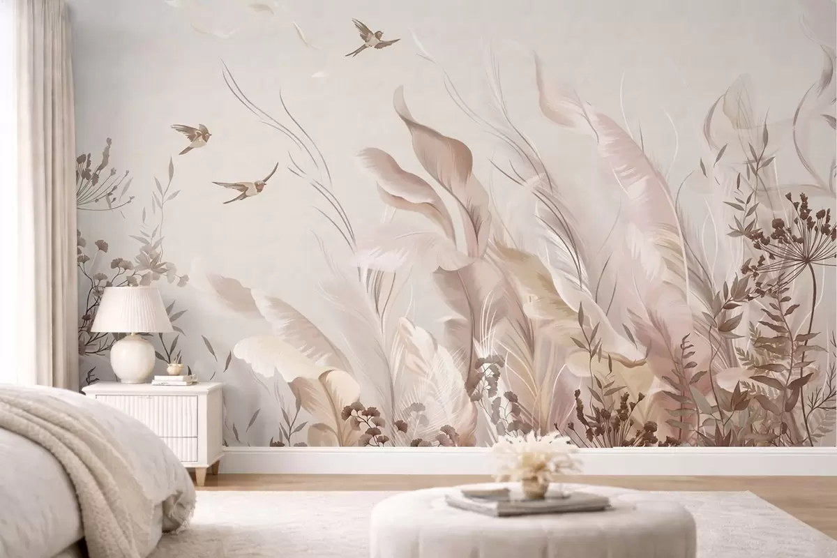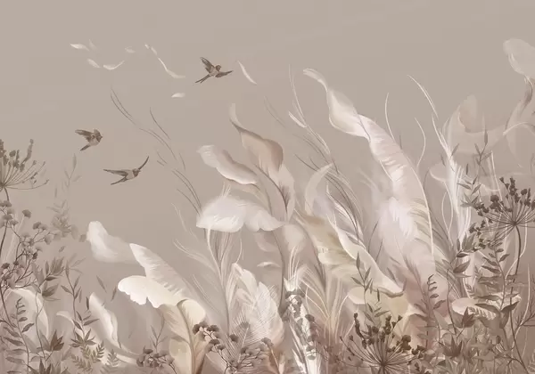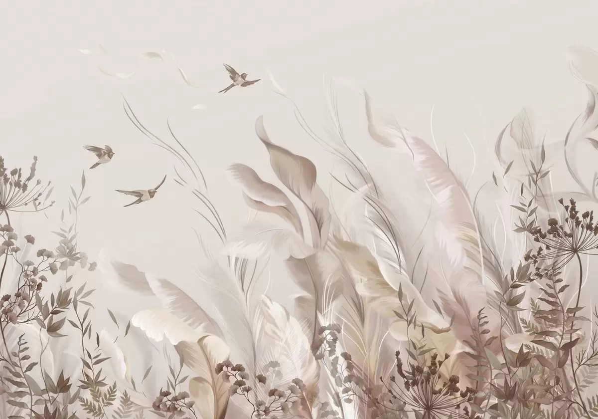 Fototapety Jemné pierka, tráva a vtáky v svetlých odtieňoch Nr. w05395