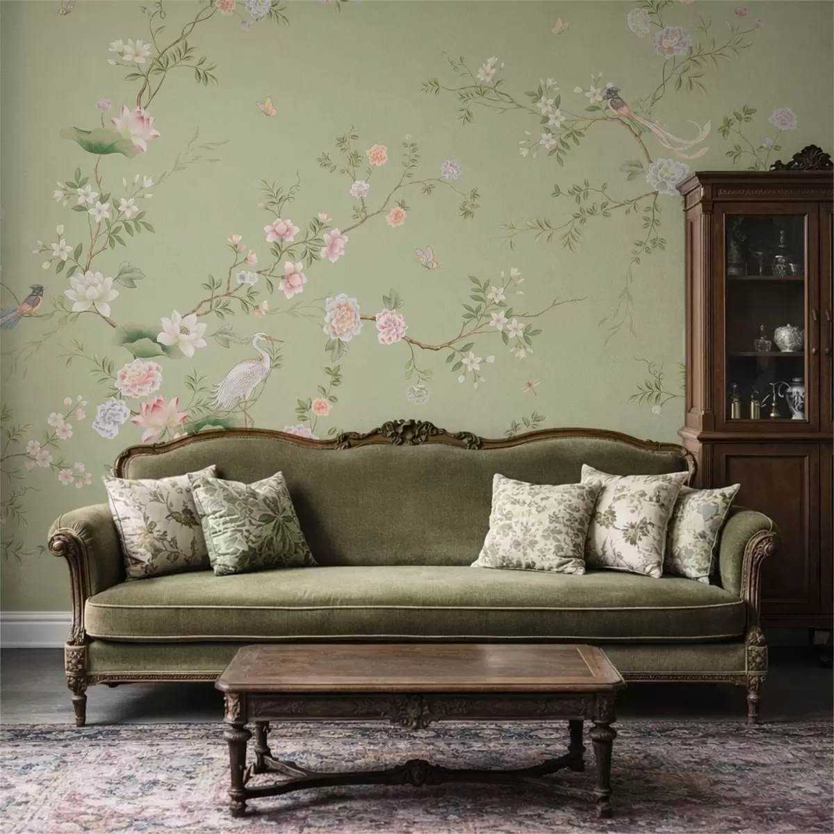 Fototapety Kvitnúce vetvičky s vtákmi na svetlozelenom pozadí Nr. w05416