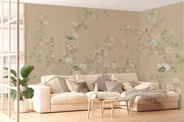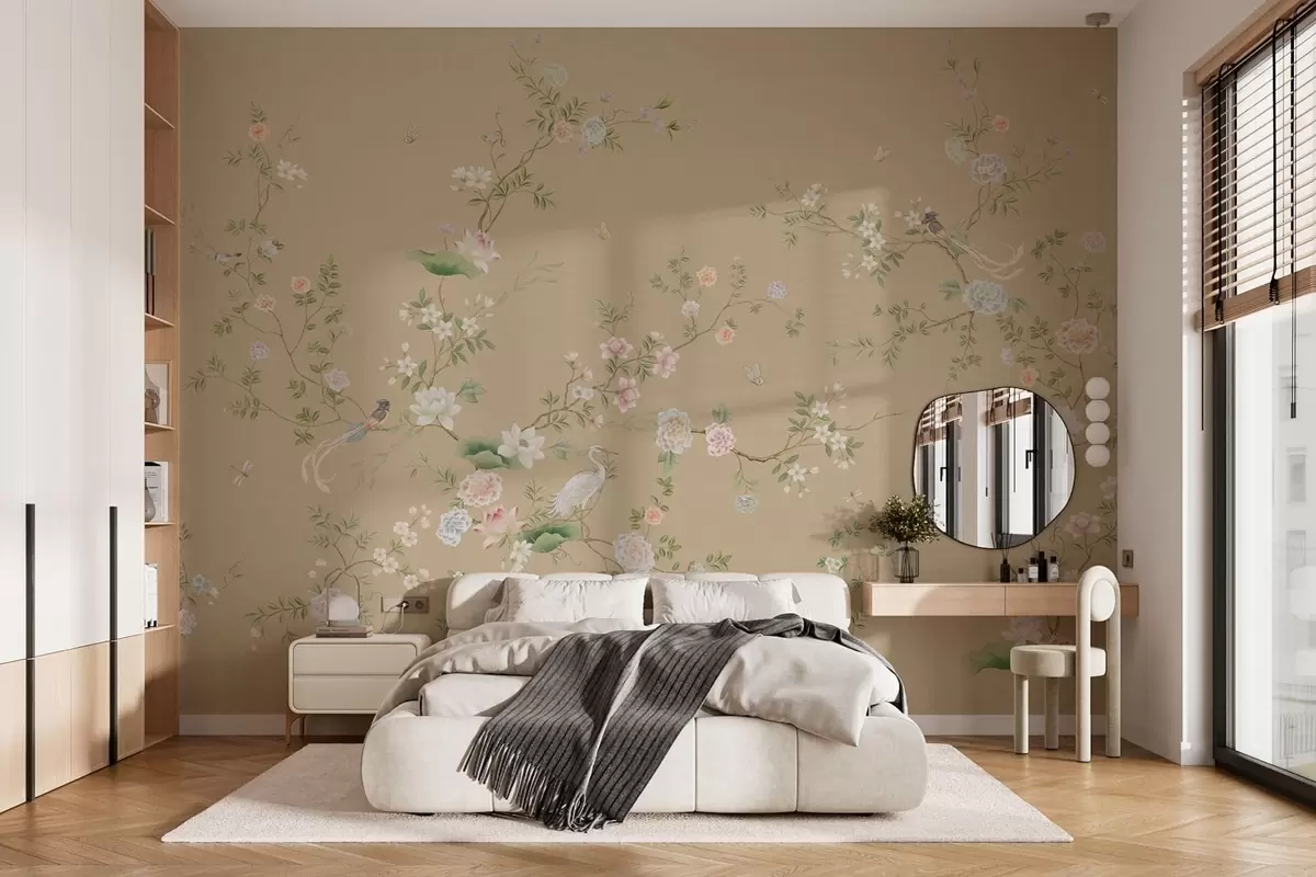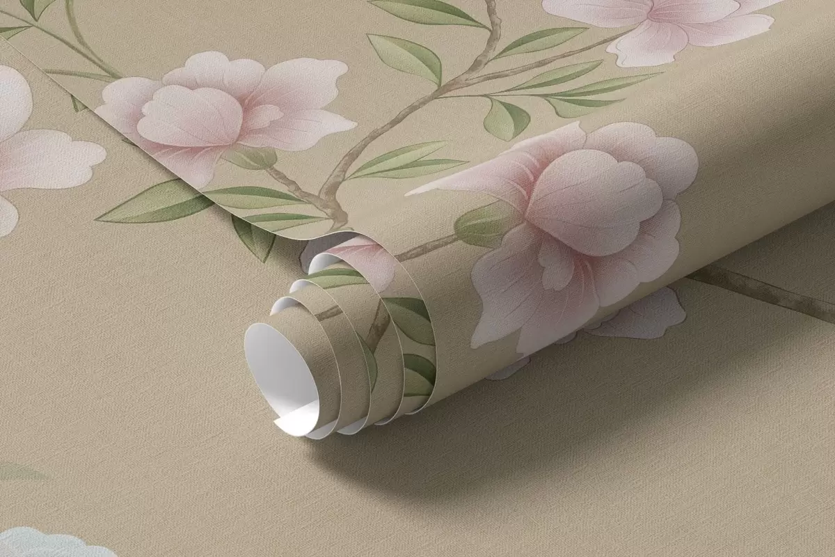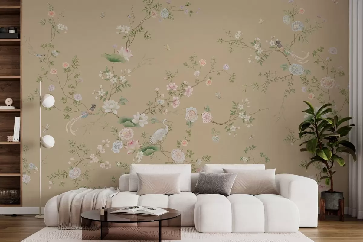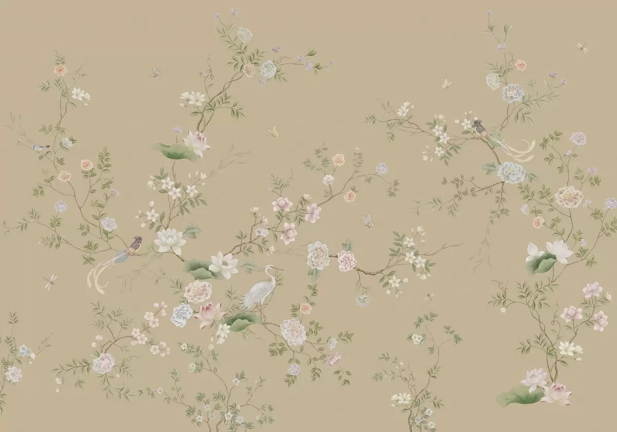 Fototapety Kvitnúce vetvy s vtákmi na teplom béžovom pozadí Nr. w05416v2