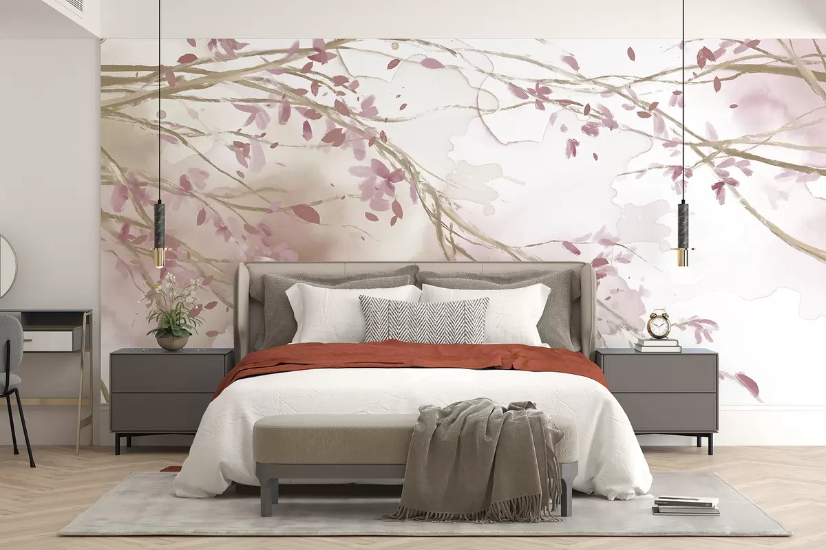 Fototapety Jemné ružové a biele kvetinové vetvy s jemným, rozmazaným akvarelovým pozadím Nr. w07919v1