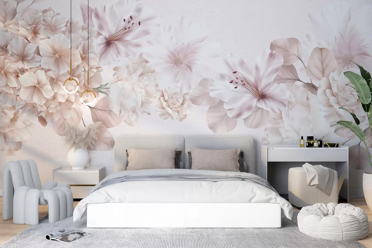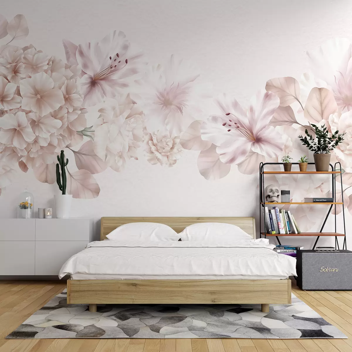 Fototapety Jemný ružovo-biely kvetinový aranžmán s jemnými okvetnými lístkami a kvetmi na svetlom pozadí Nr. w07923
