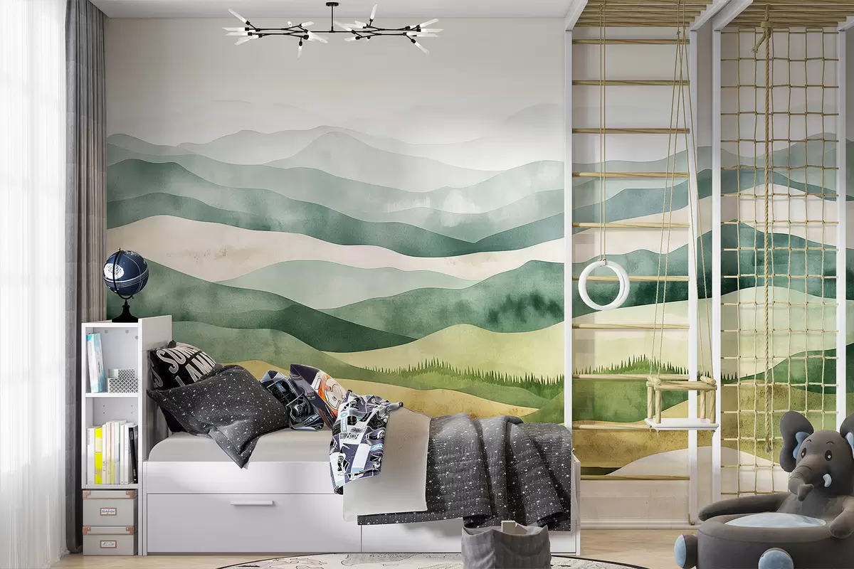 Fototapety Akvarel horská krajina, les, prírodné zelené a béžové farby Nr. w07950