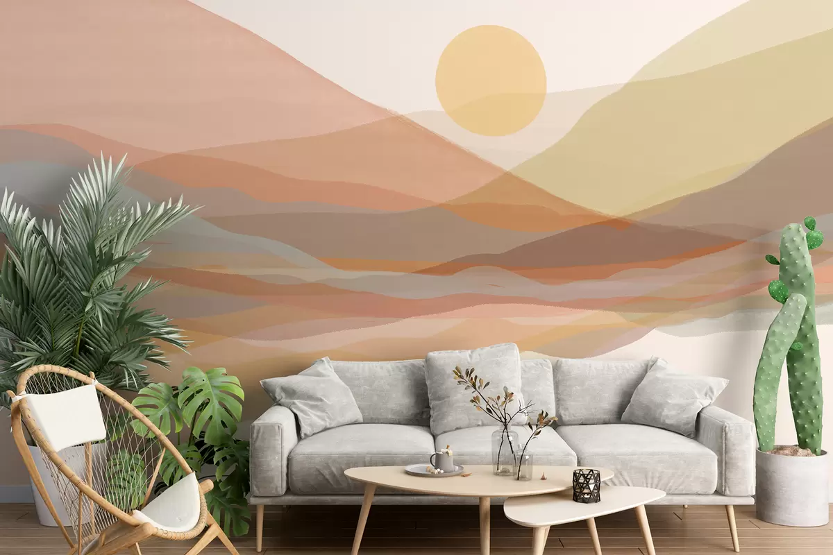 Fototapety Hornatá krajina s teplým slnkom na oblohe, zvlnené kopce v odtieňoch oranžovej, žltej a hnedej Nr. w07976