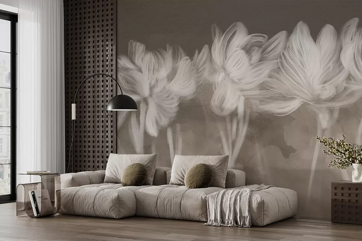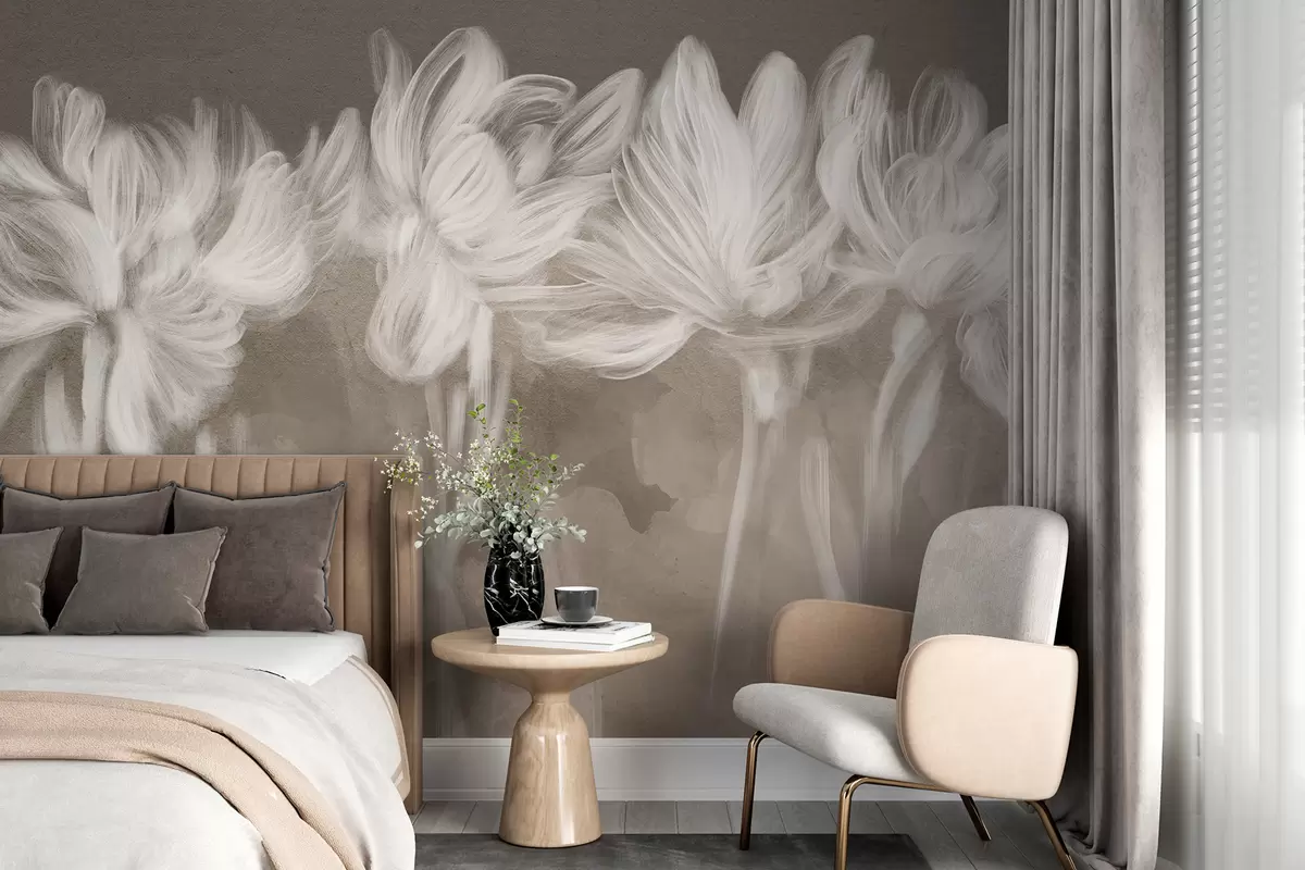 Fototapety Jemné minimalistické biele priehľadné kvetinové siluety na hnedom textúrovanom pozadí Nr. w07986