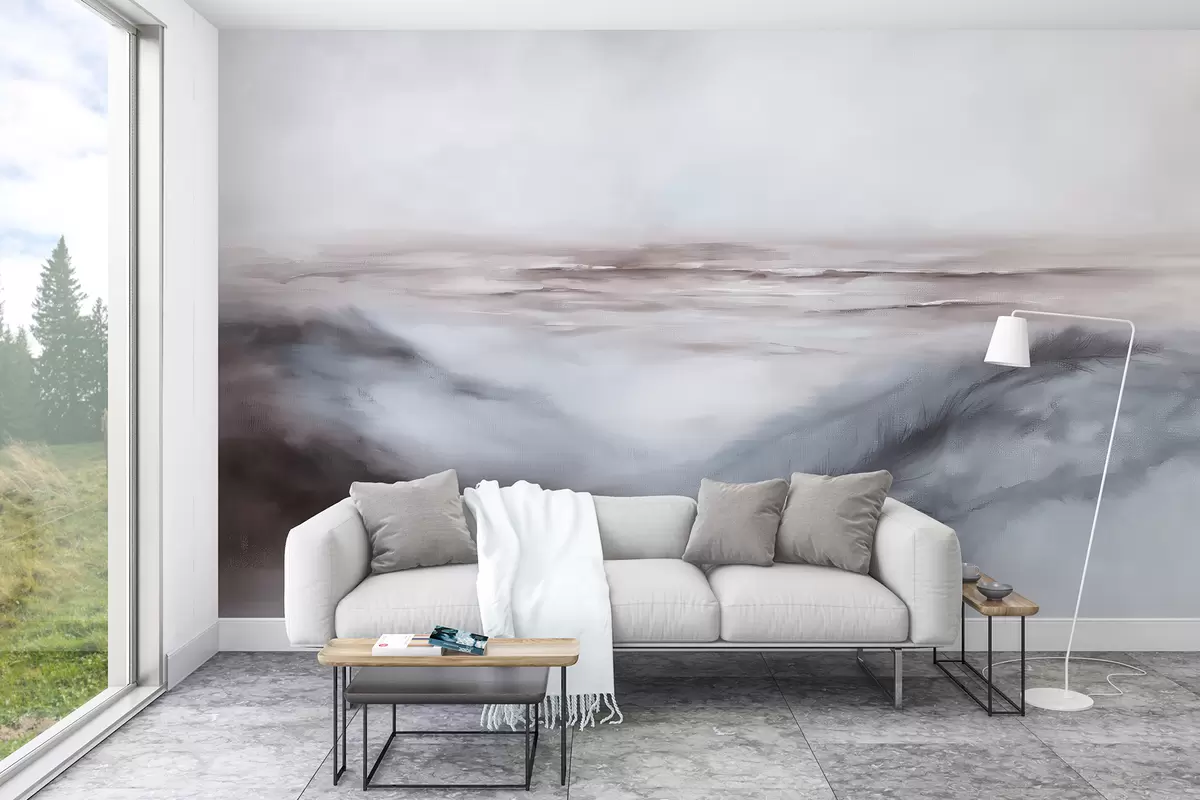 Fototapety Abstraktná krajina v pastelových farbách, ťahy štetcom, pláž, more, sivá farebná paleta Nr. w08141
