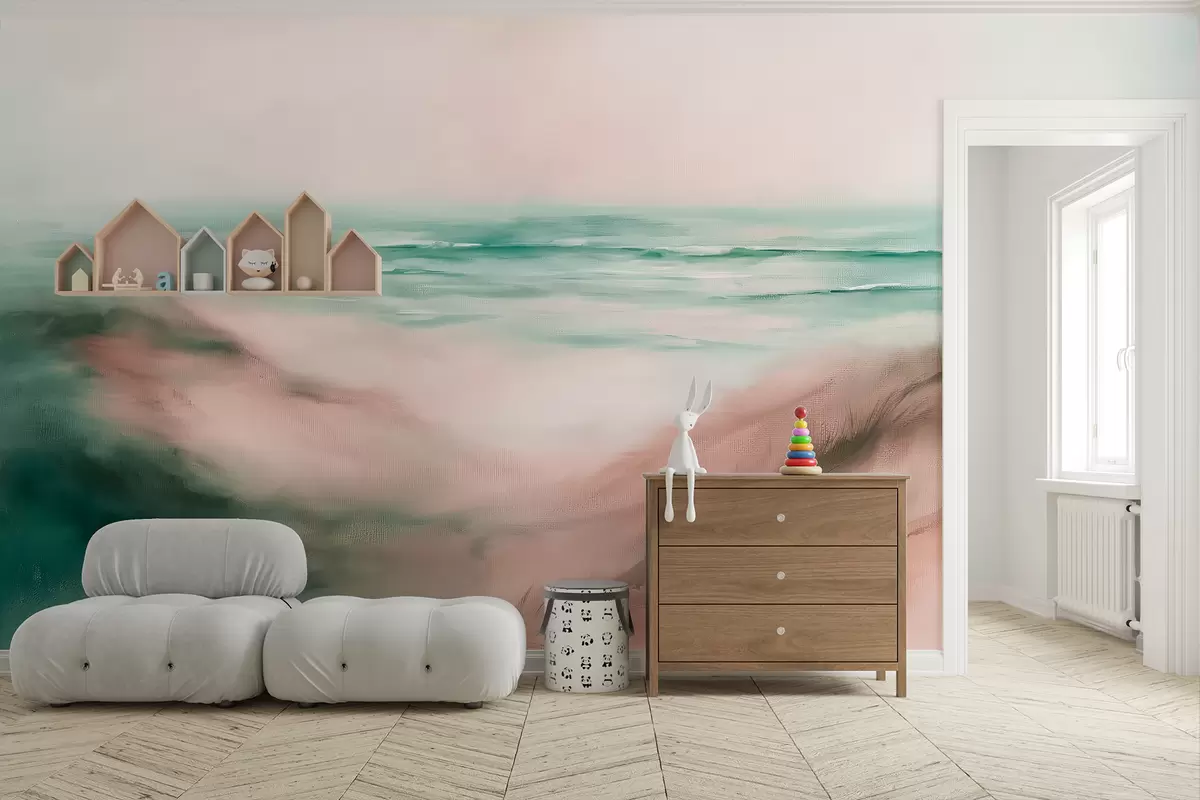 Fototapety Abstraktná krajina v pastelových farbách, pláž, more, akvamarín a ružová paleta farieb, ťahy štetcom Nr. w08141v2