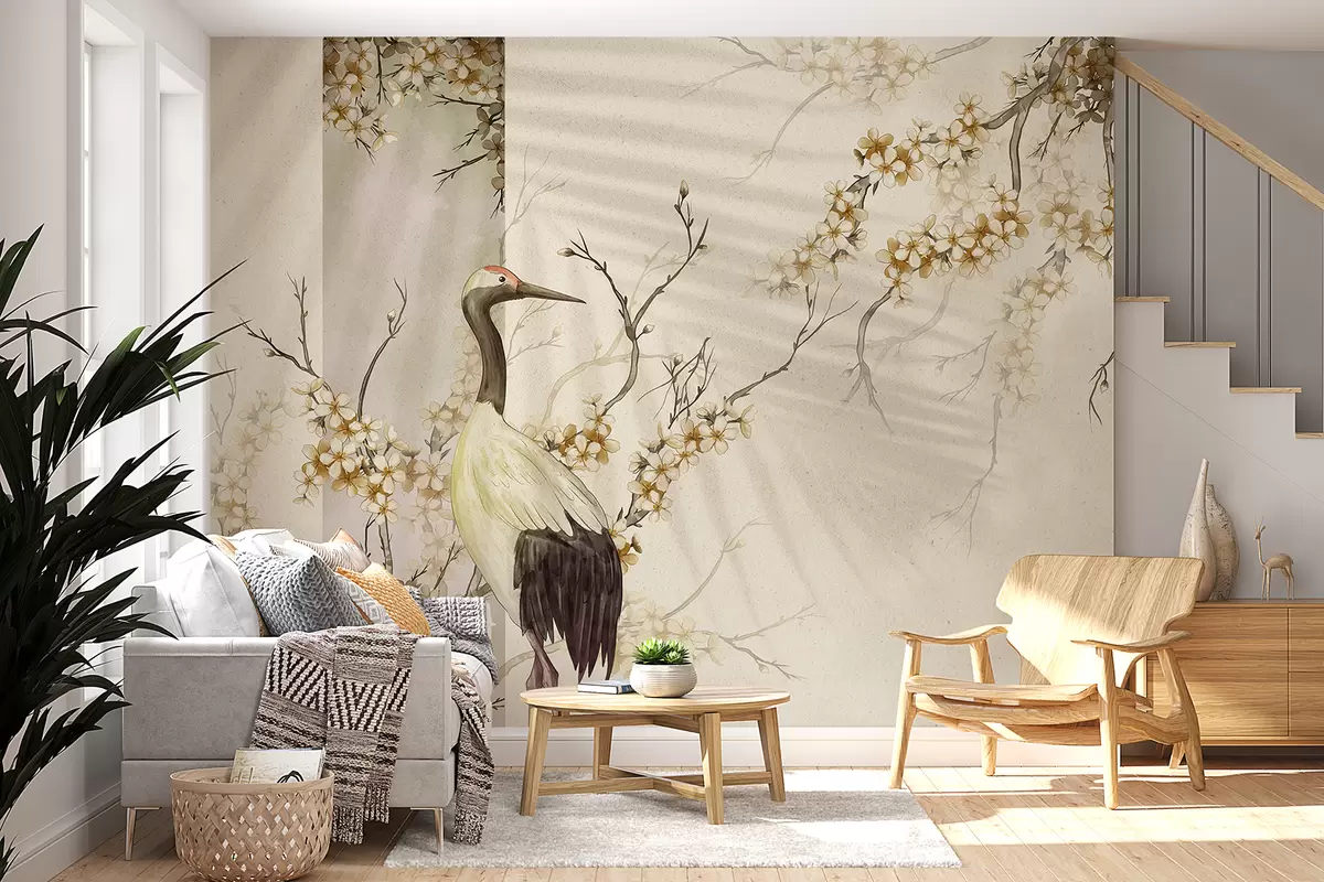 Fototapety Biely žeriav stojaci na konári s rozkvitnutými kvetmi na mäkkom, rozostrenom pozadí Nr. w08159