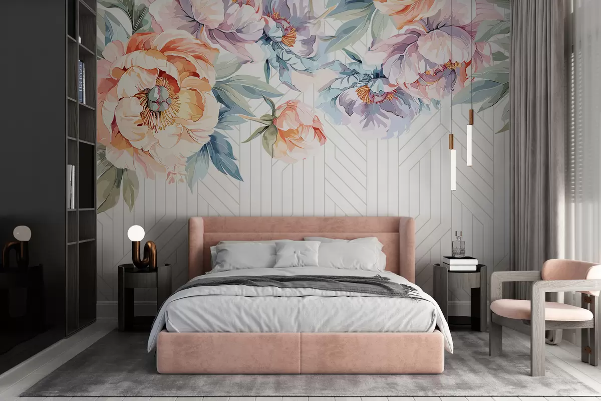 Fototapety Žiarivé broskyne a ružové abstraktné pivonky so zelenými listami na bielom a sivom pozadí Nr. w08183