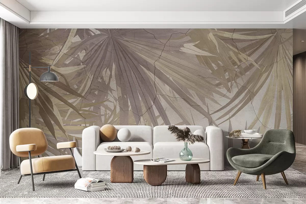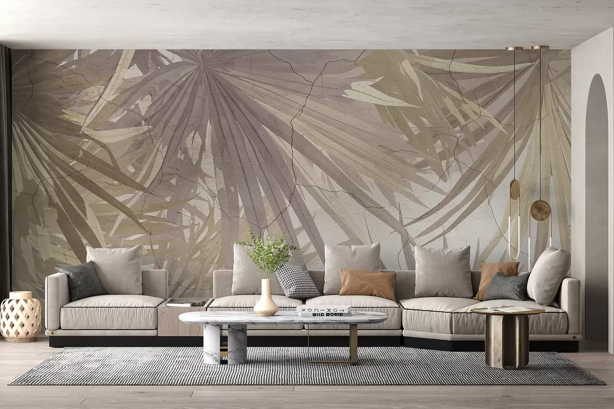 Fototapety Svieža tropická zeleň s veľkými hnedými palmovými listami na mäkkom, zahmlenom pozadí Nr. w08187v1