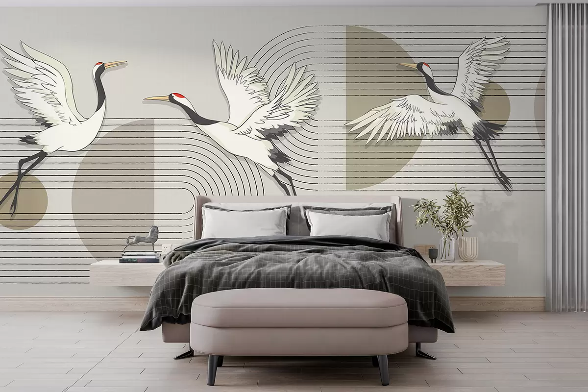 Fototapety Tri biele žeriavy v lete na geometrickom minimalistickom pozadí so sústrednými kruhmi Nr. w08188