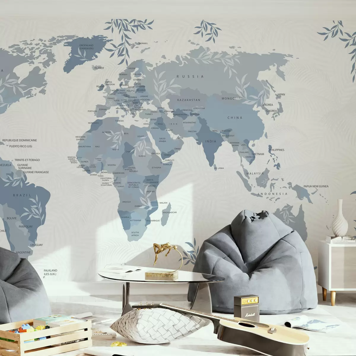 Fototapety Štýlová mapa sveta s listami a rastlinami modrej farby Nr. w08211v4