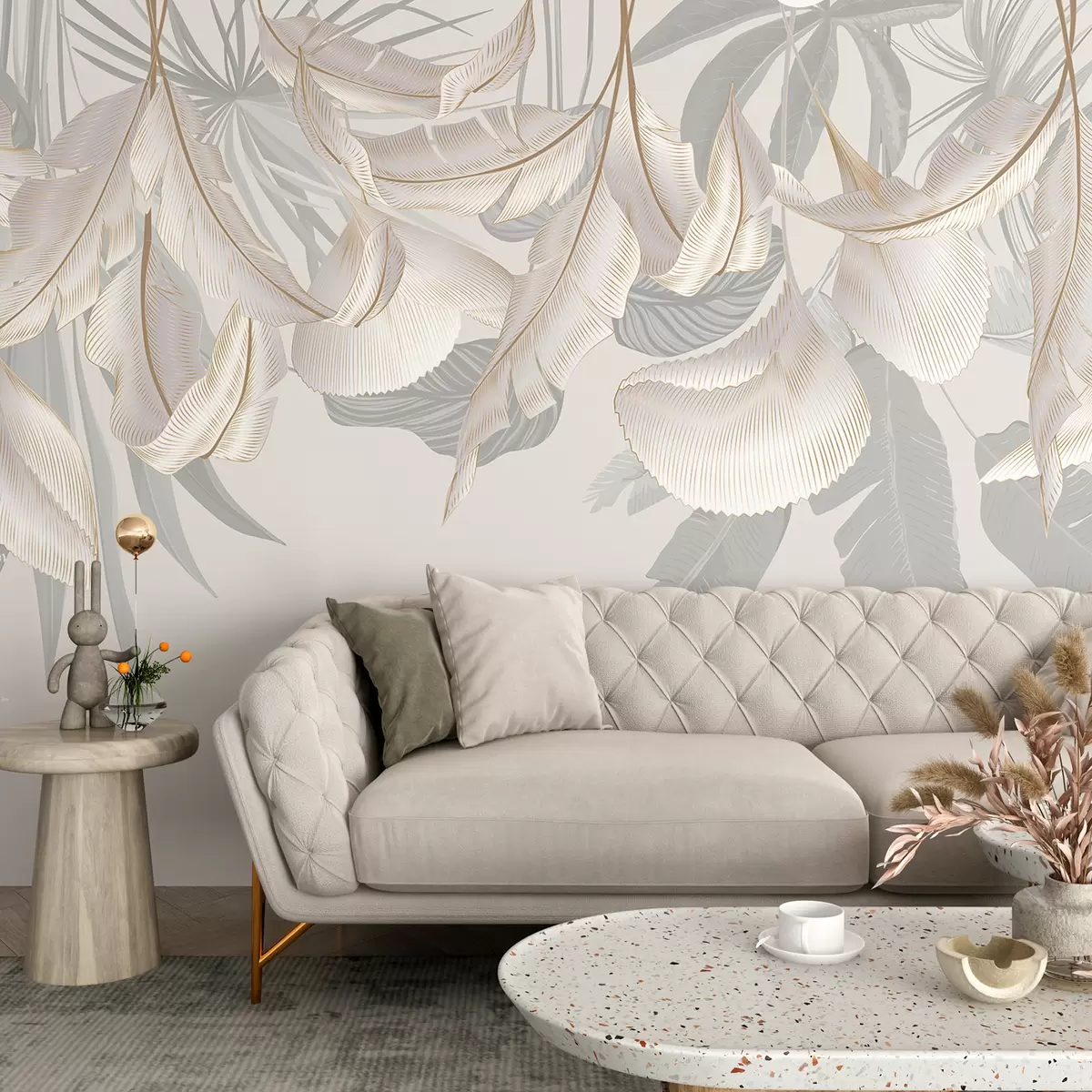 Fototapety Jemné biele a sivé kvetinové tropické listy vytvárajú mäkké, éterické pozadie Nr. w08217