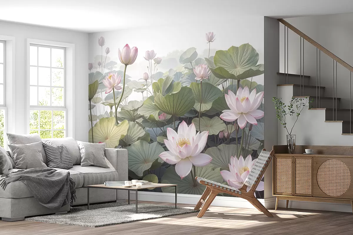 Fototapety Ružové a biele lotosové kvety s veľkými zelenými listami, obklopené zahmleným, atmosférickým pozadím Nr. w08221