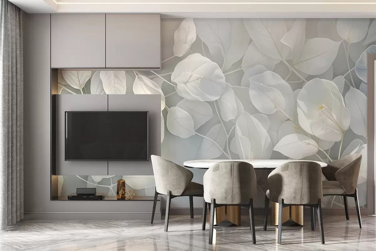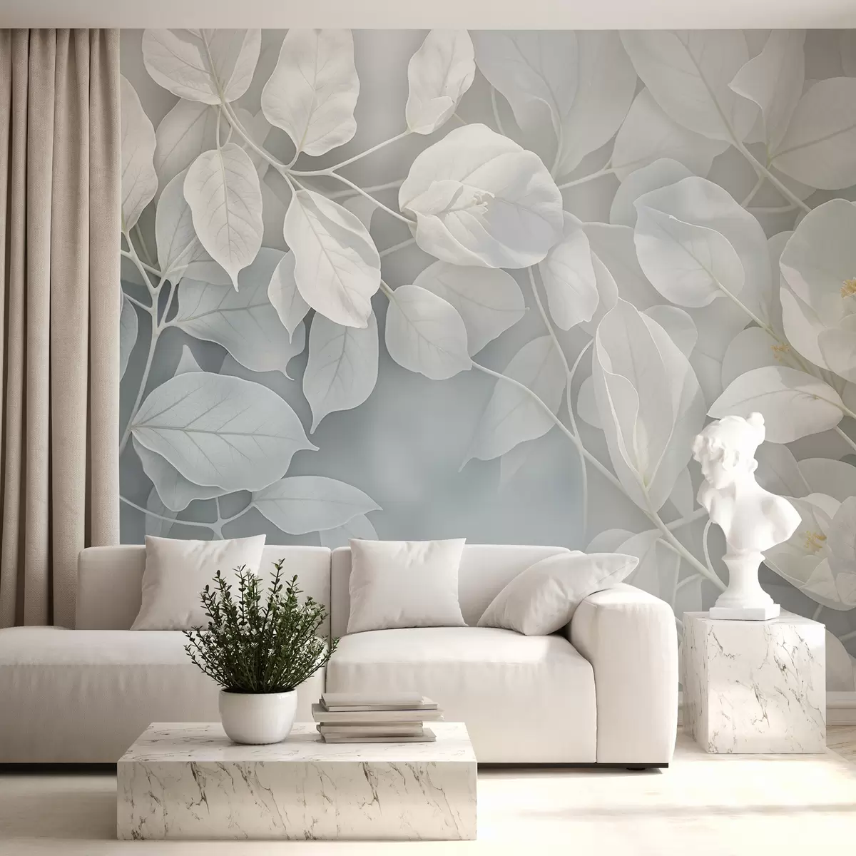 Fototapety Mäkké, jemné biele kvety so sivozelenými listami na rozostrenom pozadí, ktoré vytvárajú pokojnú atmosféru Nr. w08232