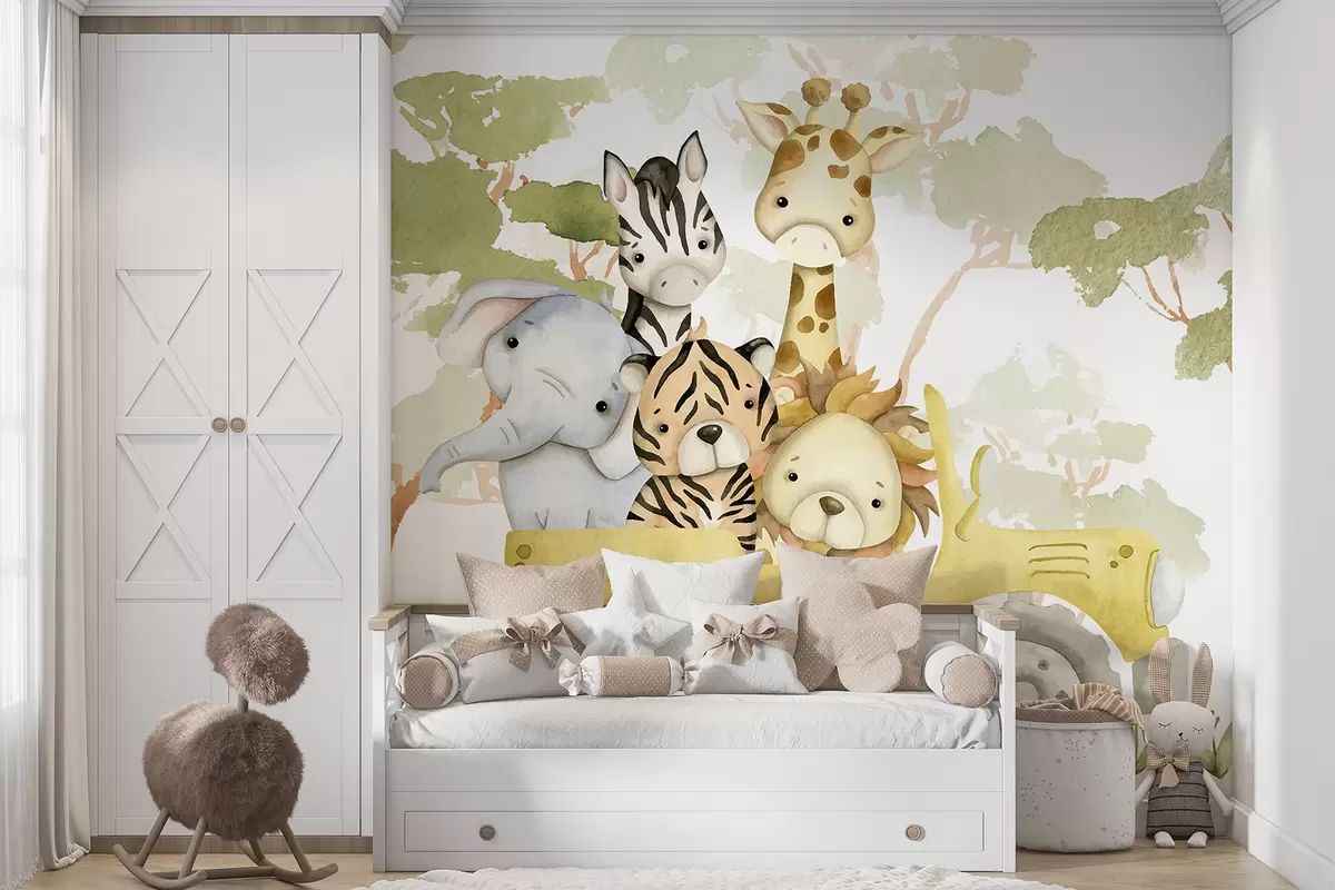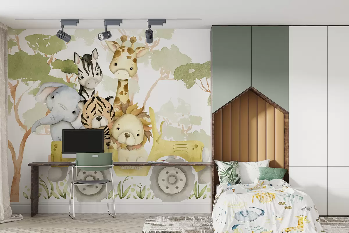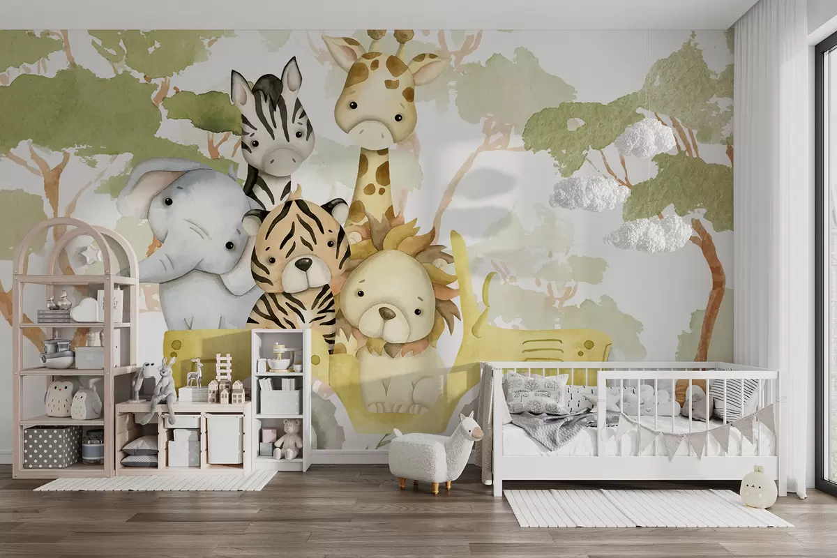 Fototapety Žlté nákladné auto prevážajúce žirafu, tigra, králika a slona na pozadí zeleného lístia Nr. w08233