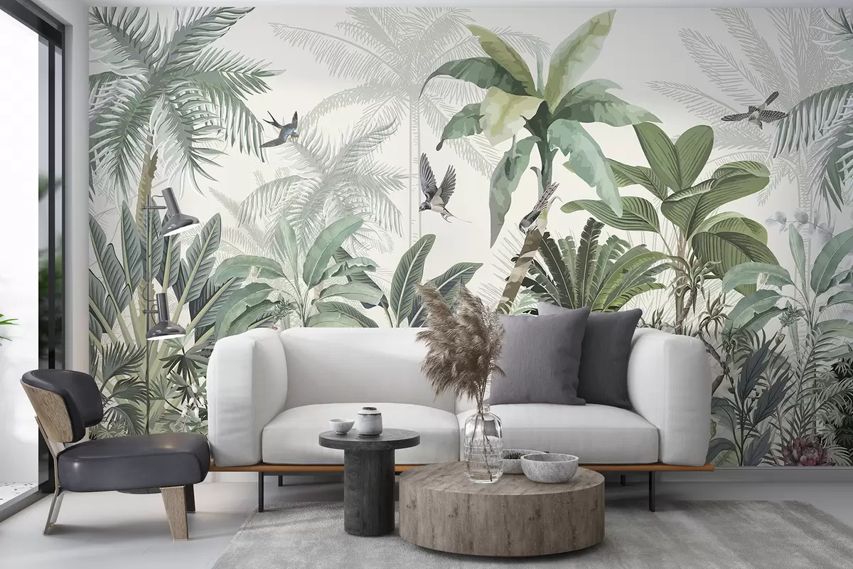 Fototapety Svieža scéna tropickej džungle s rôznymi palmami, veľkými listami a farebnými kvetmi v popredí Nr. w08239