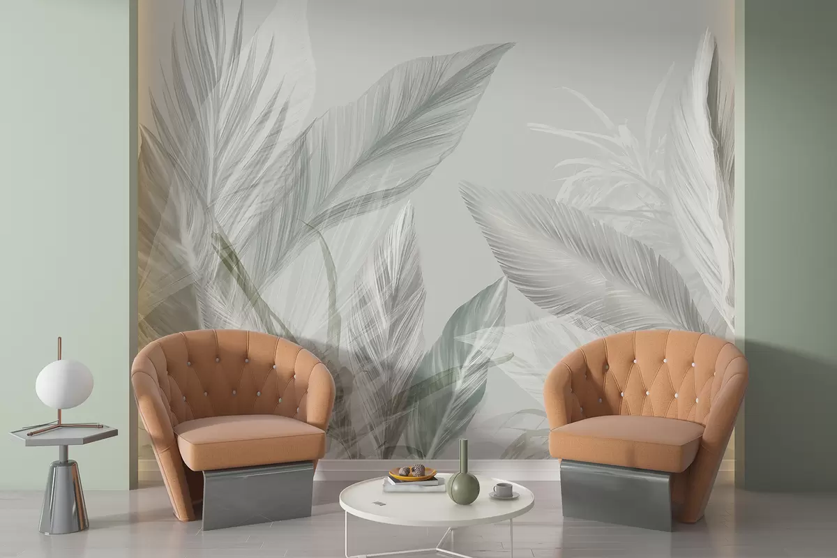 Fototapety Mäkké biele, zelené a sivé perie a tropické listy plávajúce na svetlom pozadí Nr. w08241