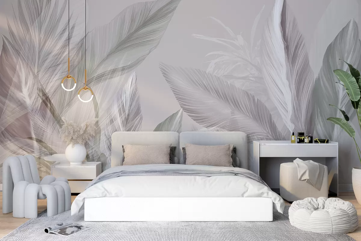 Fototapety Mäkké biele, ružové a sivé perie a tropické listy plávajúce na svetlom pozadí Nr. w08241v1