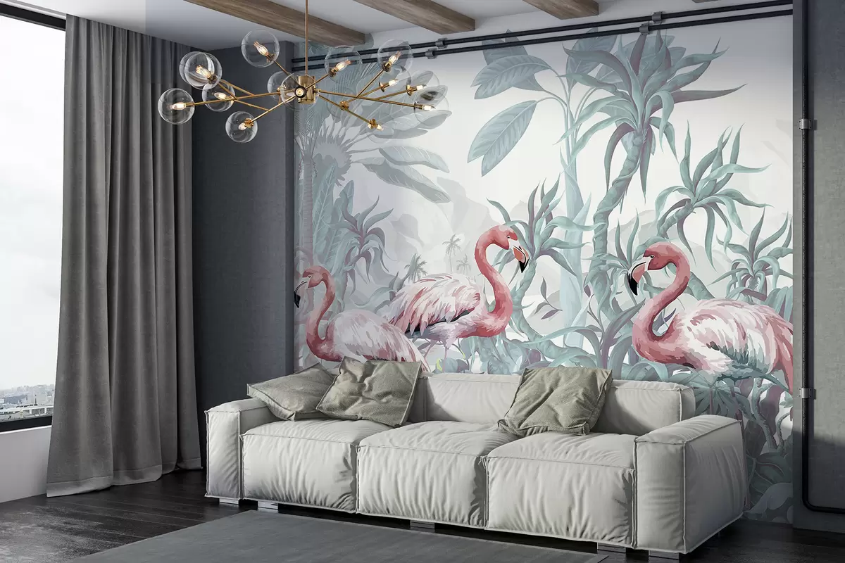 Fototapety Ružové plameniaky stojace v bujnej tropickej zeleni s veľkými palmovými listami a kvetmi v zelených a bielych odtieňoch Nr. w08250v1