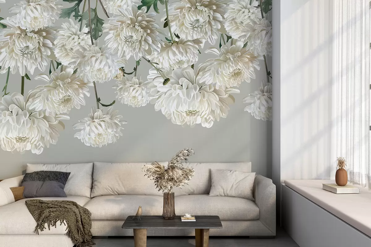 Fototapety Biele kvety chryzantémy so zelenými listami na svetlosivom pozadí Nr. w08251