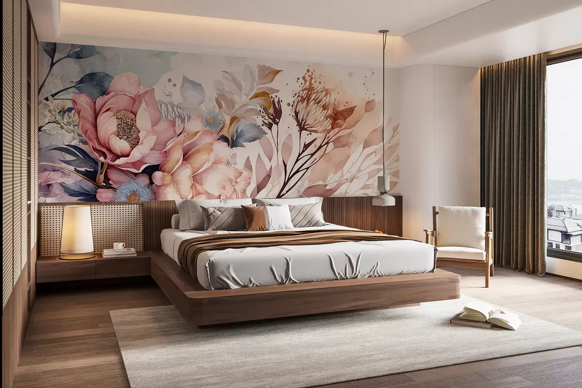 Fototapety Veľké ružové a modré kvety s jemnými okvetnými lístkami, obklopené menšími kvetmi na akvarelovom pozadí Nr. w08256