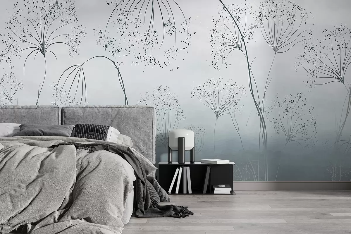 Fototapety Modré vysoké, múčnaté rastliny s jemnými kvetmi alebo semennými hlavičkami v tvare dáždnika v hmlistom, atmosférickom prostredí Nr. w08258v1