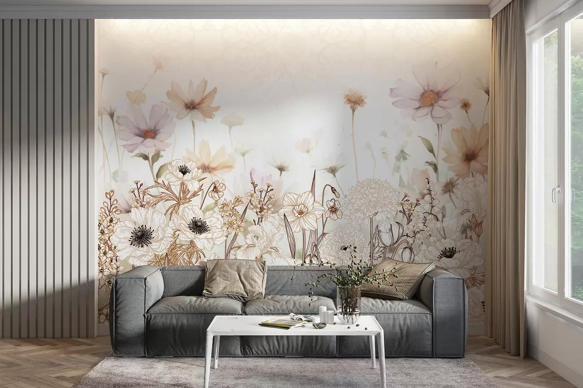 Fototapety Pole bielych, béžových a ružových kvetov a lístia na jemnom, rozmazanom kvetinovom pozadí Nr. w08259