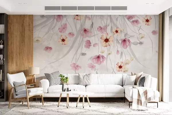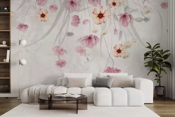 Fototapety Jemné pastelové ružové a žlté kvety so žltými stredmi kaskádovito sa rozlievajúce po jemnom, rozmazanom pozadí Nr. w08261v1