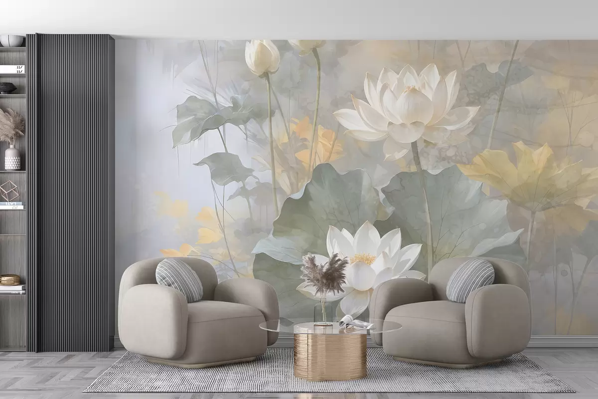 Fototapety Biele lotosové kvety s listami v rybníku s jemným, rozmazaným žltým a zeleným pozadím Nr. w08275
